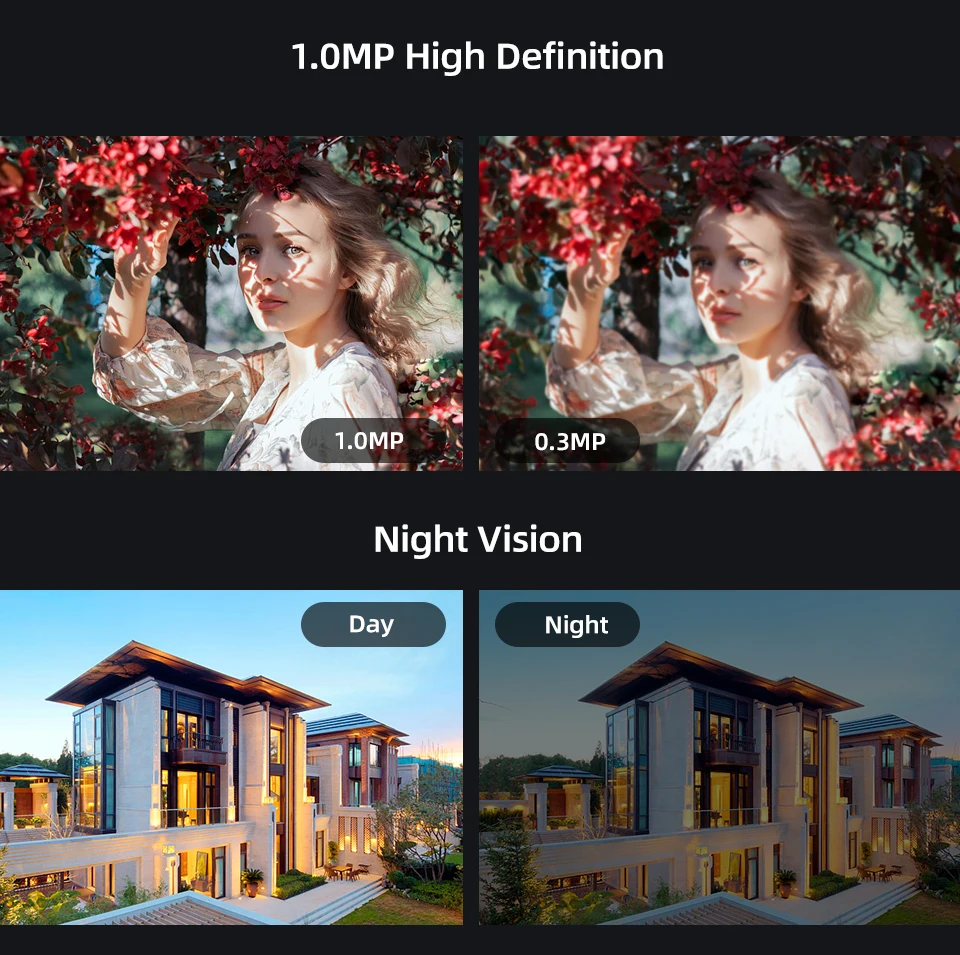 1). Светодиодный Мониторинг может четко видеть внешнюю среду даже ночью, мониторинг защищает вашу безопасность.2). Высокое разрешение 1.0MP, может более четко отслеживать каждую деталь.