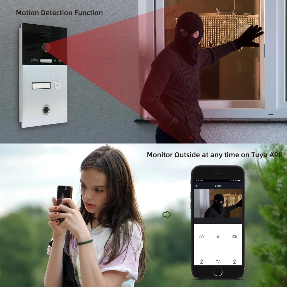 Встроенный датчик движения запускается с 2 камеры и 1 панели вызова одновременно и автоматически снимает видео, что является более эффективным для мониторинга stangers с любого угла. С morningtech, не нужно покупать дополнительный PIR датчик, экономьте небольшие деньги, но Зарабатывайте большое количество и безопасность дома, вы того стоите!