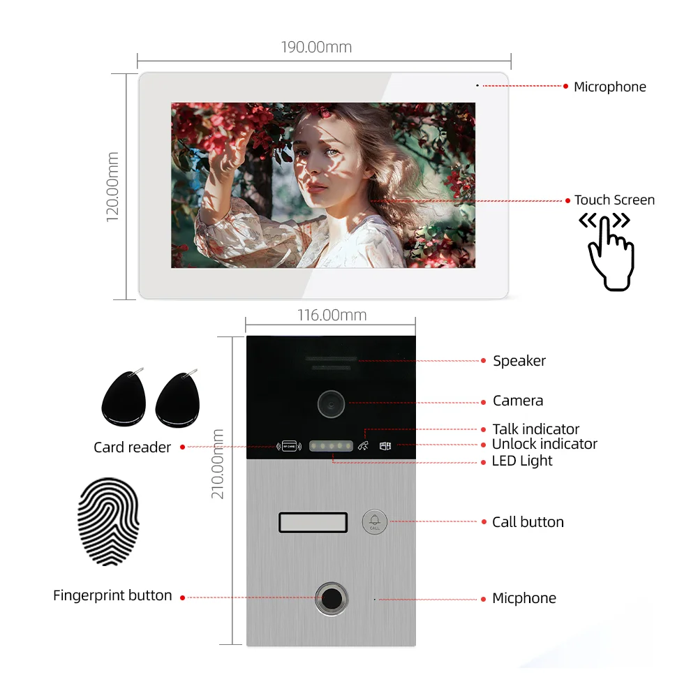 -Беспроводное подключение монитора и дверного звонка-Разблокировка отпечатков пальцев-Считыватель карт RFIC-После вызова, внутренний блок работает, чтобы разблокировать-Мобильный телефон с дистанционным управлением (разблокировка, вызов, монитор)-Внутренняя панель с сенсорным экраном