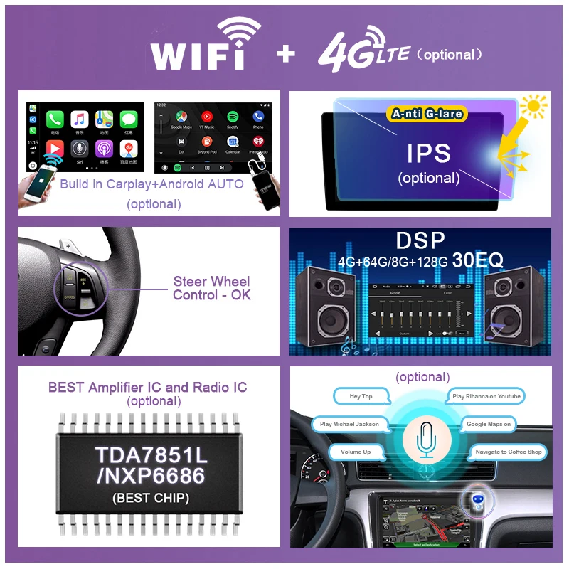 DSP (только 4G + 64G /8G + 128G имеет 32EQ)DSP = Система цифрового усилителя. Он делает звук лучше, чем раньше, и делает радиосигнал лучше, чем раньше. Только менее высокая версия автомобиля имеет заводскую систему DSP на рынке. Если вы покупаете этот чип. В будущем у вашего автомобиля будет DSP система.