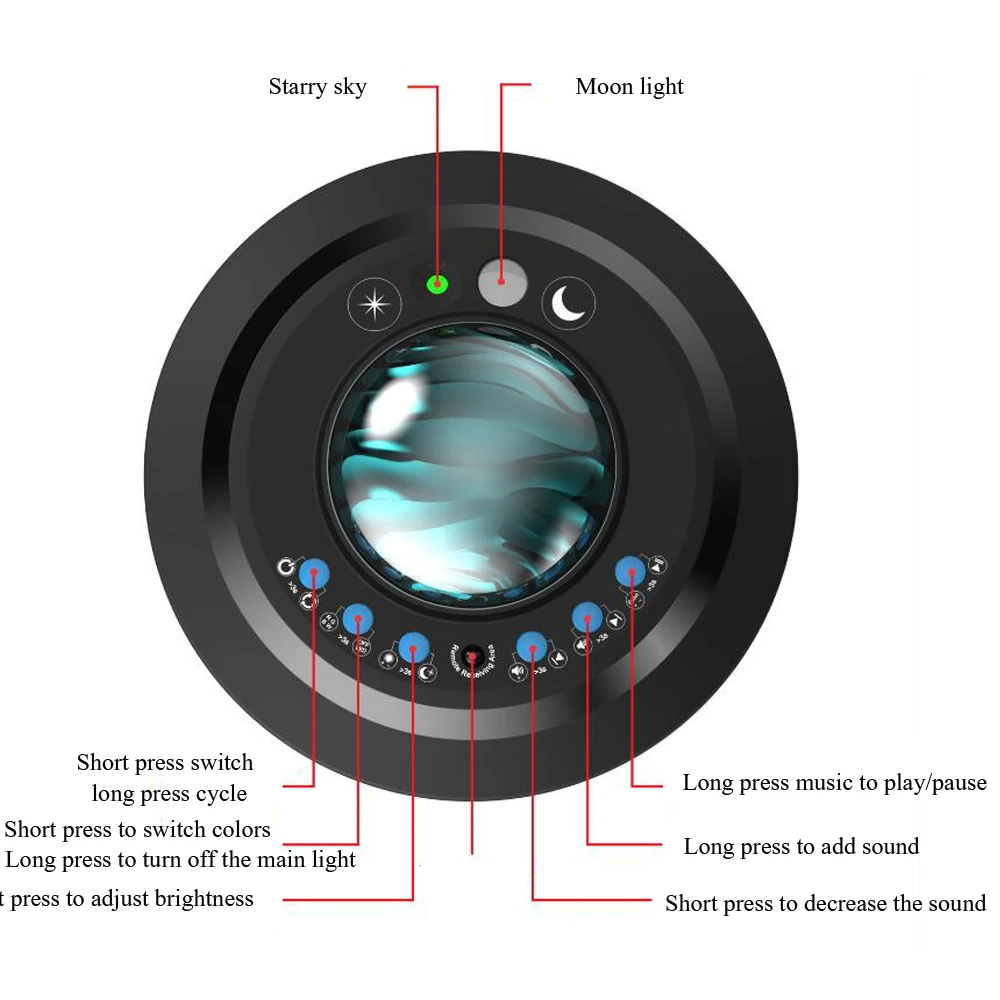 * 21-цвет динамический проекции: пять стандартных цветов, а именно красный волна воды, голубая вода, волна, зеленый волна воды, белая волна воды и зеленая лазерная точка. Каждые два цвета можно смешивать, и каждые два цвета волны воды также могут быть смешаны с зелеными лазерными точками. Пусть вы получите до 21 цвета. Разные цвета в сочетании с динамической ночной проекцией на разных скоростях создают расслабленную, романтичную и красочную атмосферу космоса, показывая вам великолепное звездное небо.