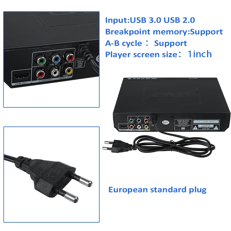 Характеристики:-Частота отклика: 40 Гц-22 кГц-SNR:>90 дБ-Мощность питания: переменный ток 110V-240V 50/60Hz-Мощность: 15 Вт-Рабочая температура: от 5 ℃ до 30 ℃-Измерение: 320*200*38 мм-Размер экрана плеера: 1 дюйм-Вход: AV, USB3.0, USB2.0, MMC/SD/MS 3 в 1 кардридер-Память точки останова: Поддержка-Цикл A-B: suppport-Несколько воспроизведения: DVD видео/DVD + RW/-RW/+ R/-R-CD аудио/CD-R/-RW/VCD/SVCD-JEPG/MP3/WMA/Dual Disc-JPEG Viewer/изображение Zoom