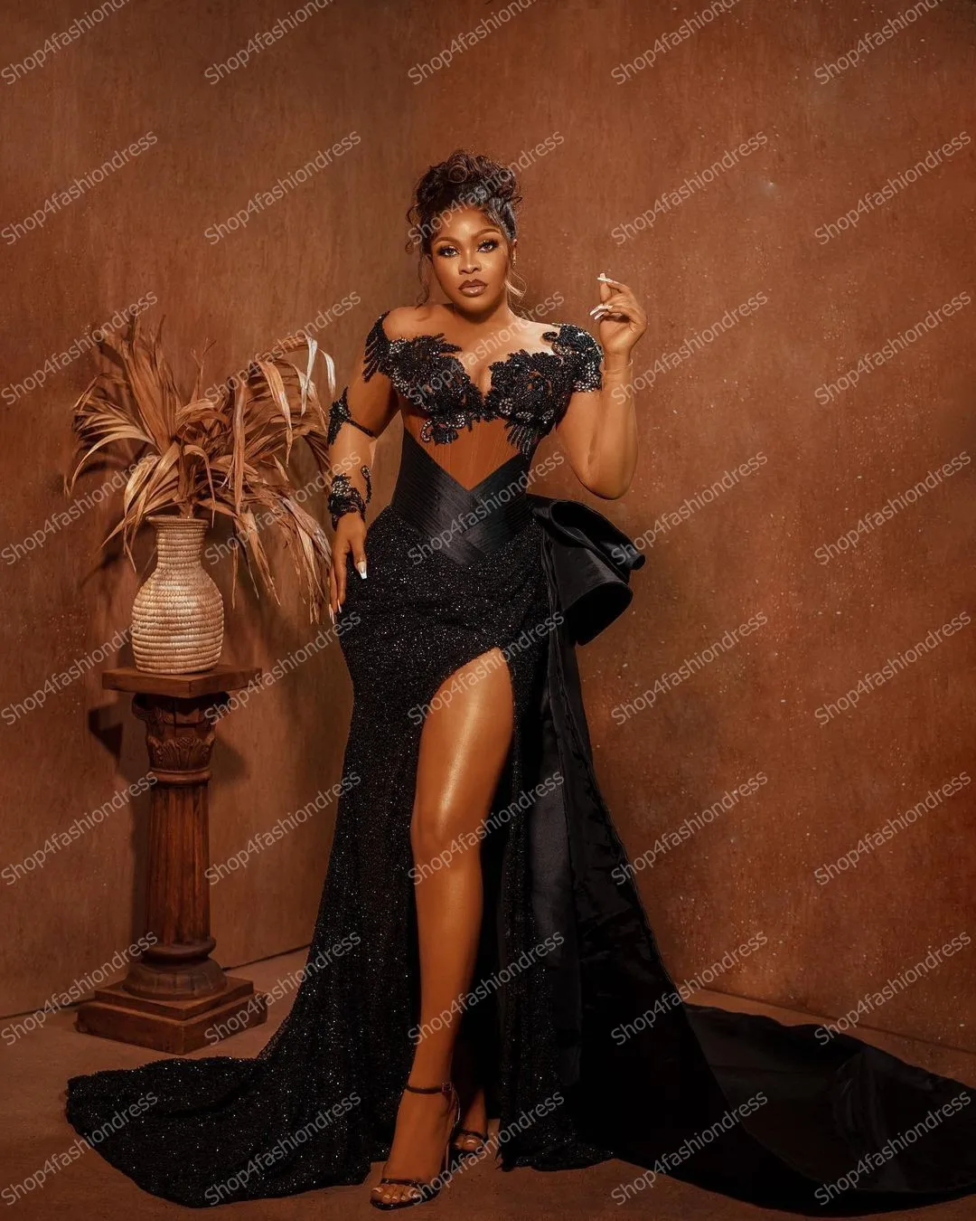 Женское вечернее платье со съемным шлейфом Aso Ebi, черное платье с бусинами, V-образным вырезом и разрезом сбоку, платье для выпусквечерние вечера