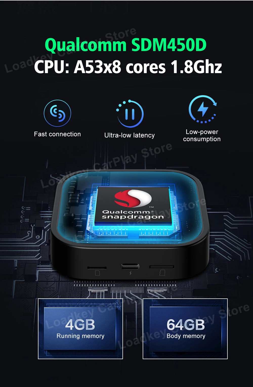 Особенности✔Устройство, док-станция Qualcomm 8-ядерный процессор, низкая потребеление энергии, высокая производительность.✔Система Android 9,0, беспроводная CarPlay, беспроводная Android Auto в один модуль.✔Предоставляем магазин Google Play. Бесплатная загрузка и установка различных приложений.✔Встроенный двойной Bluetooth для ручного вызова, музыки и подключения всех видов Bluetooth TPMS,OBDII и т. Д.✔HD видео дисплей, смотреть Youtube, онлайн навигация, онлайн радио мультимедийная система✔Встроенный 4G/3G/2G, ApplePie может использоваться в качестве мобильного WiFi маршрута, чтобы быть точкой доступа к другим устройствам✔Оперативная память 4G LPDDR3 + Встроенная память 64G EMMC Flash, Высокая спецификация конфигурации большой памяти и большой емкости памяти, масштабируемая 128GОписание⭕Процессор: ARM®CortexTM-A53 Восьмиядерный 64-разрядный Процессор, до 1,8 ГГц⭕RAM ROM: память (по умолчанию): 4 Гб LPDDR3 RAM + 64 Гб eMMC Flash⭕GPS: GPS/GLONASS/Beidou⭕GPRS: макс 107 кбит/с (дл)/85,6 кбит/с (UL)⭕WIFI: 802,11 a/b/g/n/ac, 2,4G + 5G⭕BT: 4.2BLE + 5.0BLE⭕Встроенная Активная GPS антенна, поддержка global⭕Языки, основные страны прошли сертификацию оператора⭕Рабочая температура: -30 ~ + 75 ℃⭕Вход питания: USB 5 В⭕Продукт потребеление энергии: 5V ⎓ 0.3A ~ 0.6A (макс)