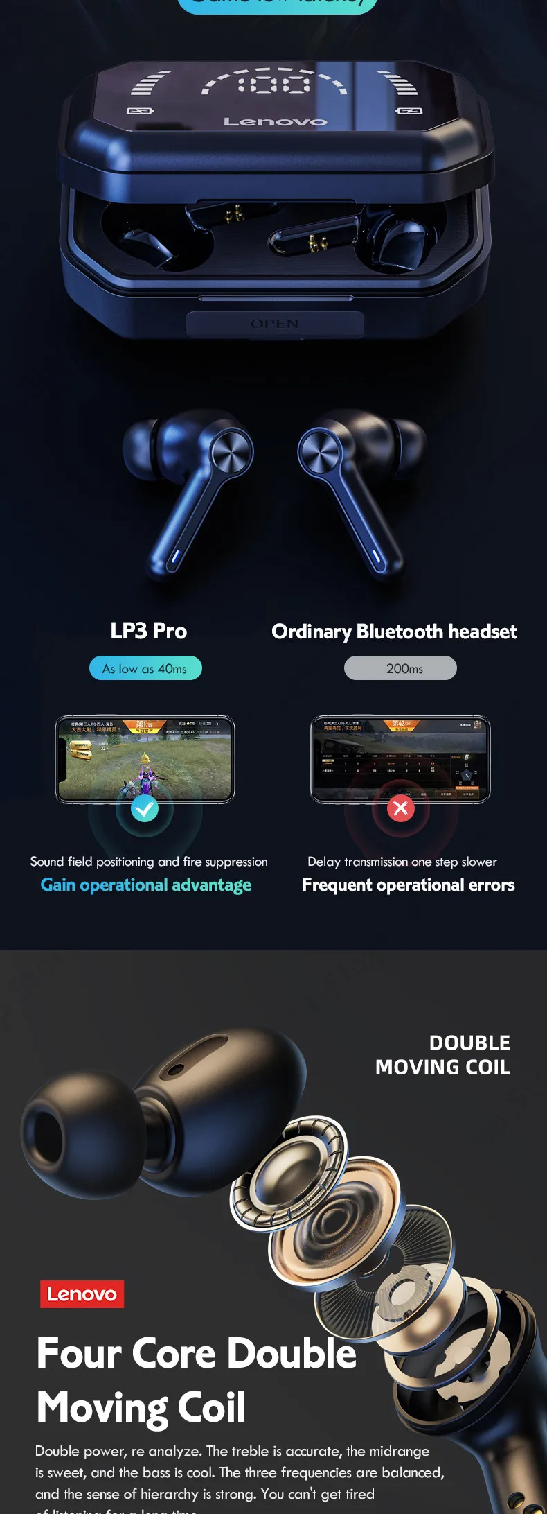 Lenovo LP3 PRO TWS Bluetooth 5,0 наушники 1200 мАч большая емкость батареи беспроводные наушники HIFI Музыкальная гарнитура с дисплеем
