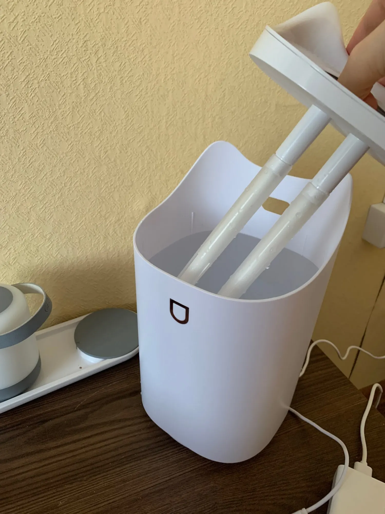 Увлажнитель понравился. Вода заливается сверху. В комплекте сам увлажнитель и провод, головы нет. Управление с помощью одной кнопки: просто нажатием выбирается один из 3 рельсов, долгим нажатием включается и выключается подсветка. Работает тихо. Для детской комнаты 12 квадратов в самый раз.