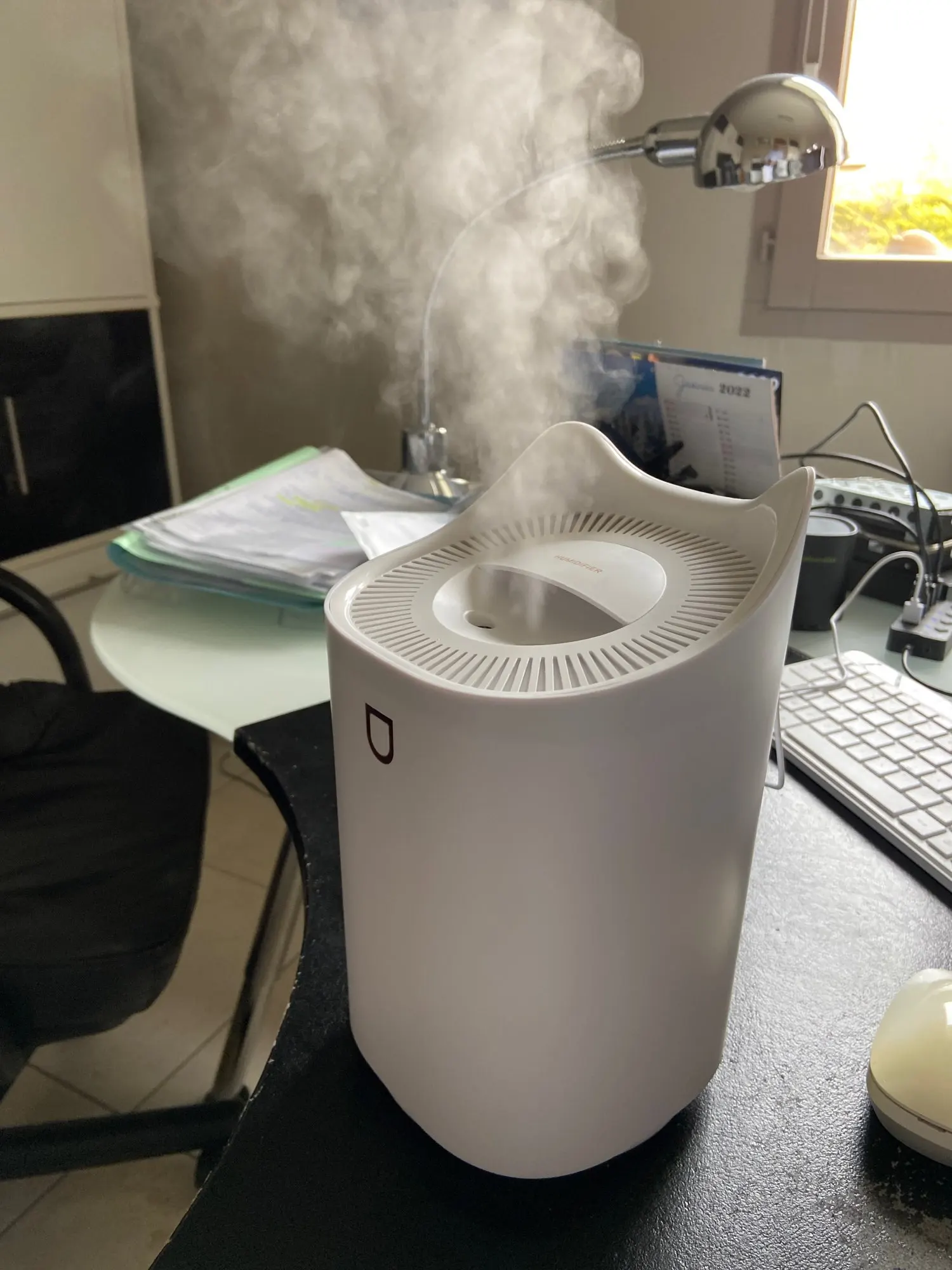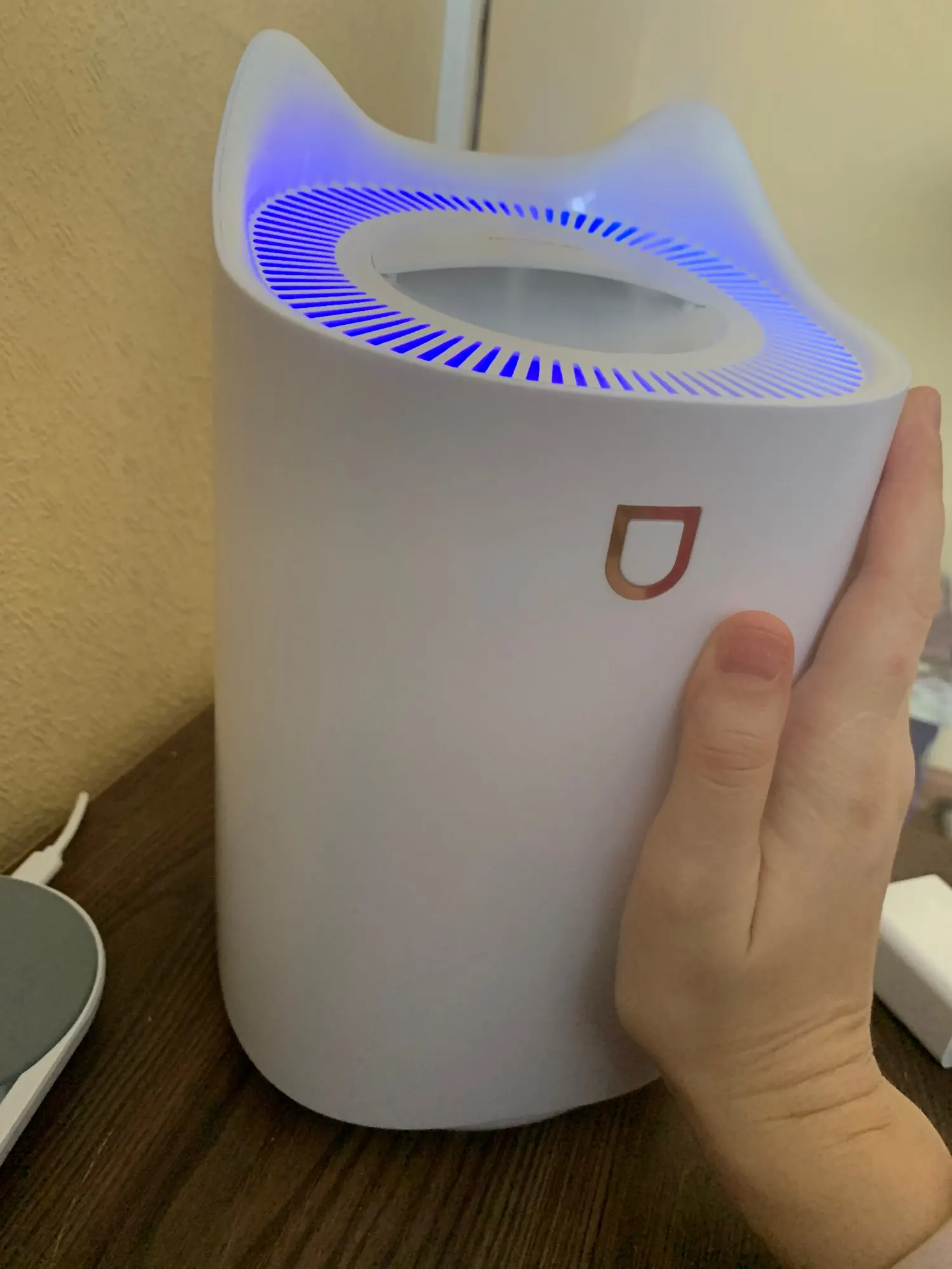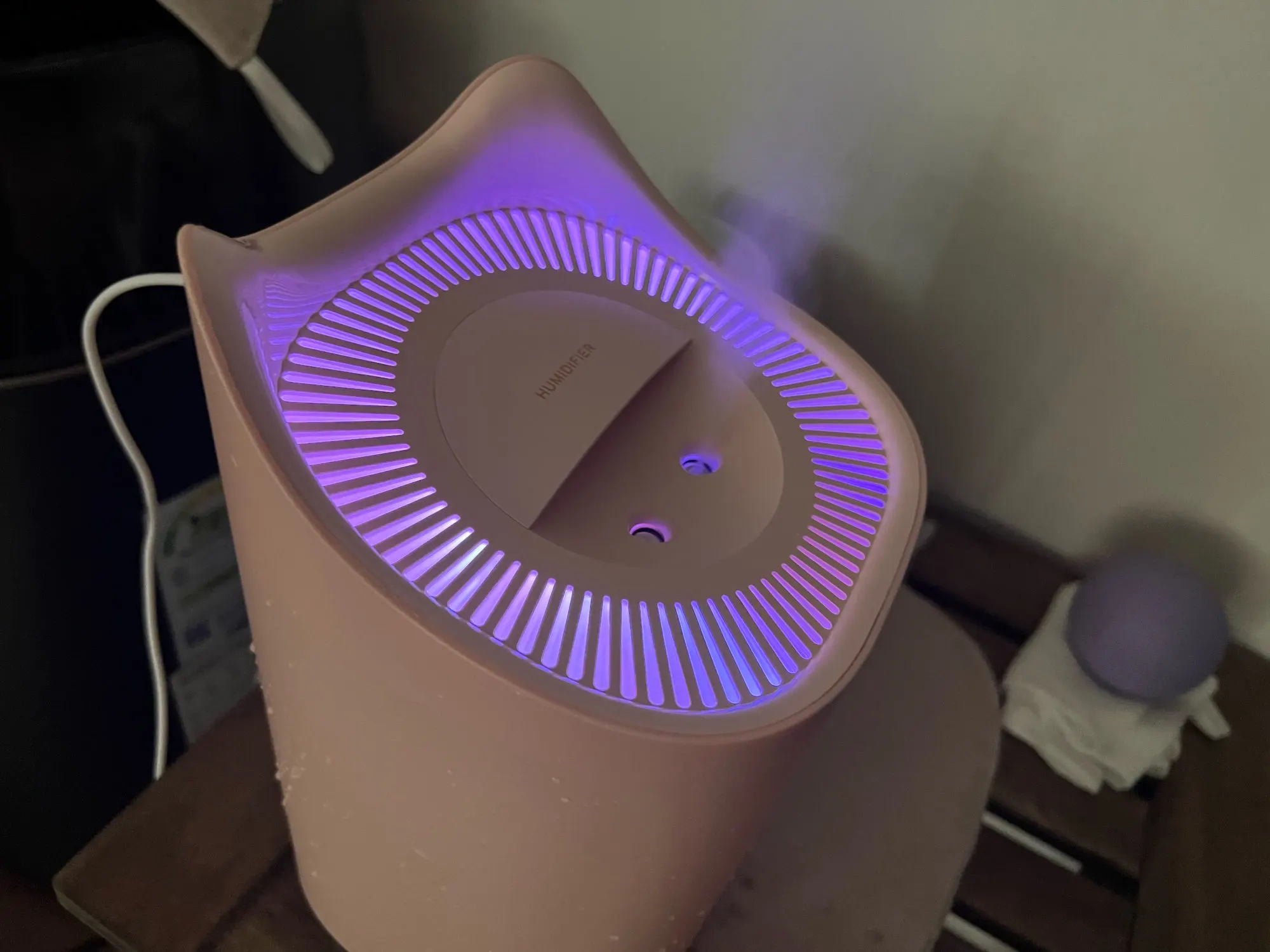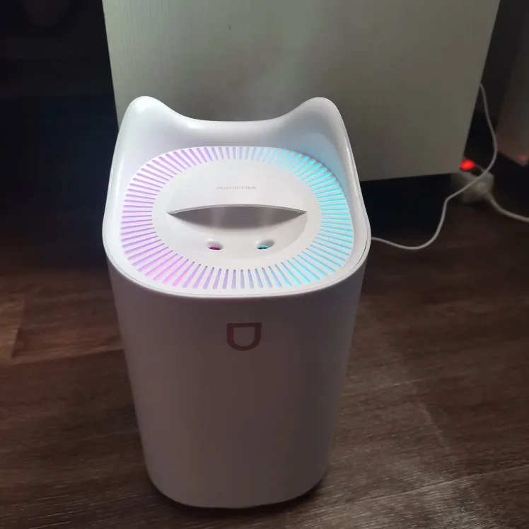 Работающий увлажнитель . управляется одной кнопкой. при первом использовании опустите в воду фильтры, вставленные в крышку, чтобы они напитались водой. если этого не сделать, пар не идёт и кажется, что товар бракованный. есть несколько режимов подсветки и пара. небольшой, компактный.