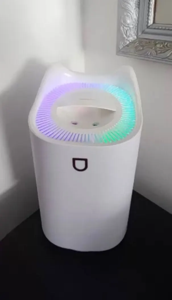 Так же, как на картинке. Очень тихо, чтобы быть двойной выходом. Материал лучше, чем другие, которые сделаны из кепки, это лучшее качество пластика, он не гибкий, но это хорошо. Большая емкость с двойным выходом, которая может быть отрегулирована на одном выходе, хотя это некоторое время, и она меняется сама по себе на другую частоту так неоднократно. Есть также прерывистый мотоцикл, это удивительно. Светодиодный свет меняет цвет сам по себе, его нельзя регулировать, но если его можно снять или надеть, затягивая единственную кнопку. Очень хороший стиль дорогой кошки. Плохо то, что он не имеет захвата для транспортировки и логически полон веса и скольжения, советую оставить фиксированный и заполнить водой или перевозить вакуум jj