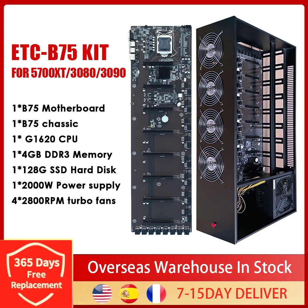Семейная каркас материнской платы для майнинга, поддержка 8 ГПУ слотов с материнской платой B75 + 4 Гб DDR3 + процессор G1620 + SSD 128 ГБ + блок питания 2000 Вт для Рига BTC