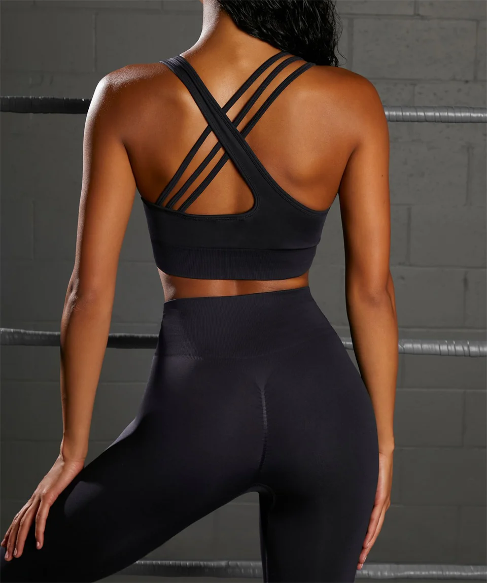 Женский спортивный костюм, комплект для йоги, однотонная Спортивная одежда для спортзала, сексуальный бюстгальтер-слинг с перекрестными лямками, бесшовные леггинсы, одежда для фитнеса и тренировок, ZF972