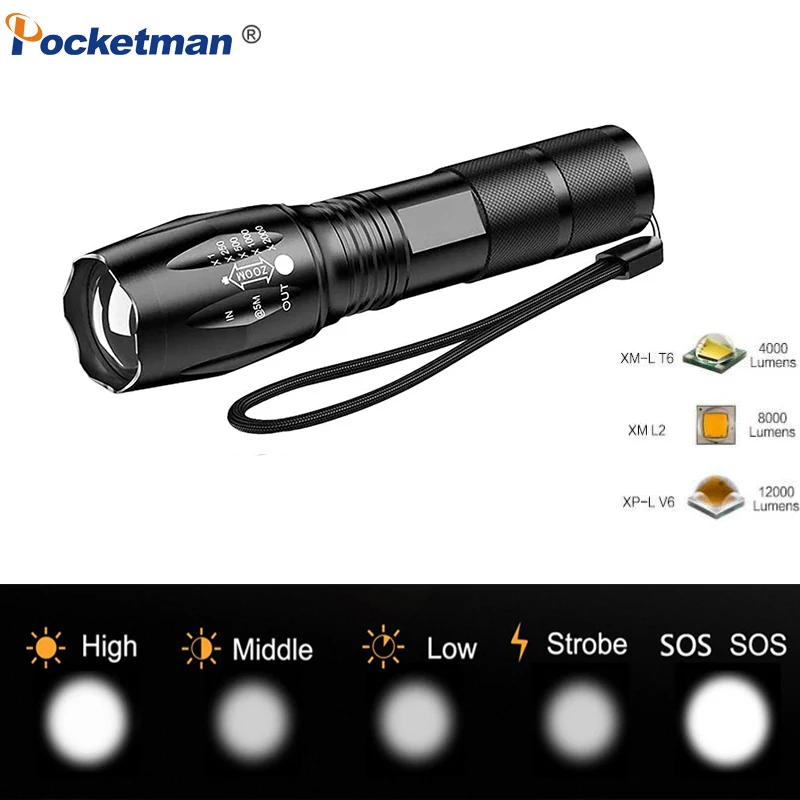 Характеристики:• Бренд: POCKETMAN• Название модели: светодиодный фонарик 007/A100/E17 T6/L2/V6• Режим: 5 режимов (высокий-средний-низкий-SOS-Стробоскоп)• Срок службы: 100000 часов• Цвет: черный• Излучаемый Цвет: белый светильник• Линзы: выпуклая линза• Материал корпуса: прочный авиационный алюминий• Аккумулятор: 1x18650 / 3 x AAA• Масштабируемый: Поддержка