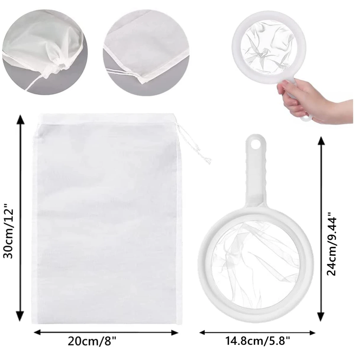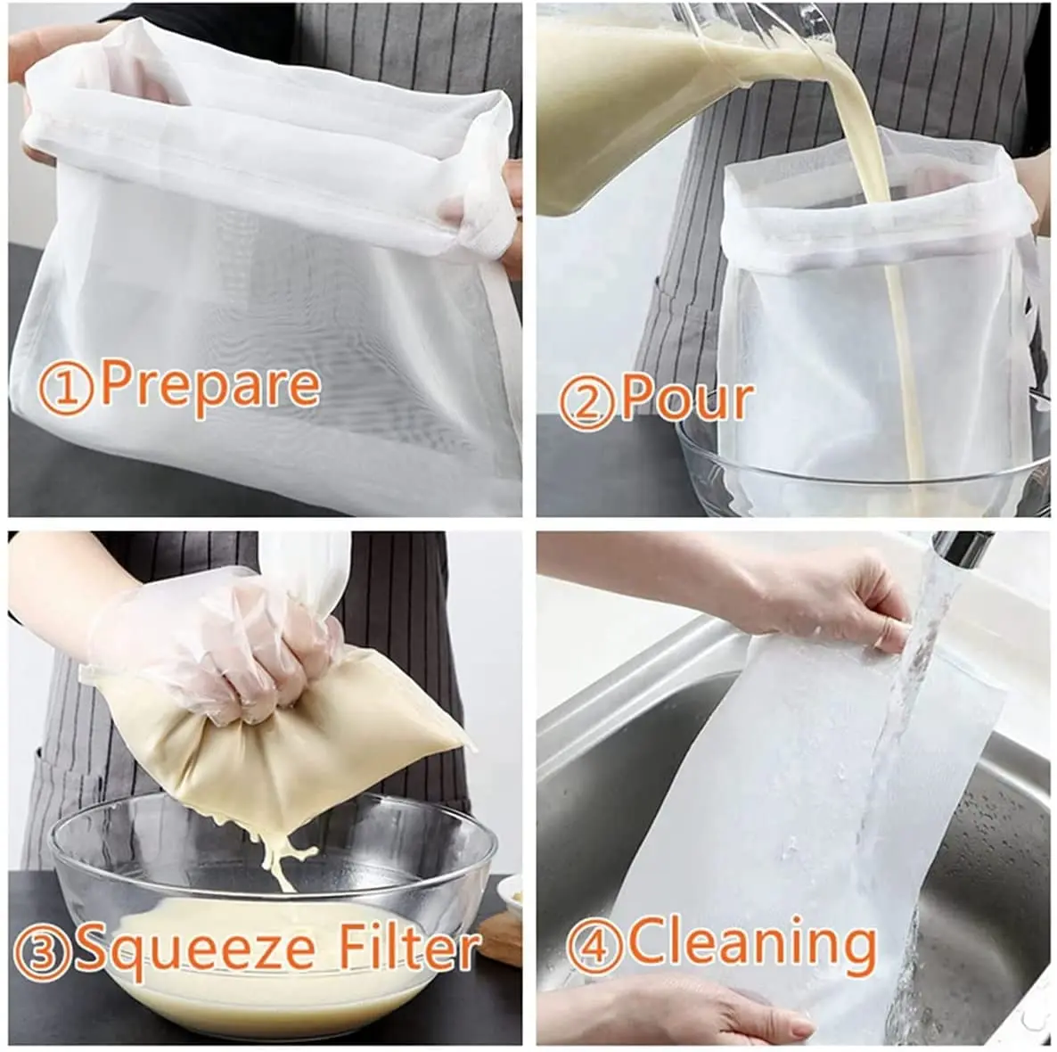 Многоцелевое Использование: хорошо подходит для приготовления орехового молока, соевого молока, холодного заваривания, овощного сока, супа, желе, пивоварения, фруктового вина, пивоварения, масляного фильтра. Префект для мешочек орехового молока, приготовления пищи, напряжений, фильтрации, полировки, многих других кухонных и домашнего использования. Сделайте свои собственные напитки и закуски, чистая и здоровая еда для вас и вашей семьи.