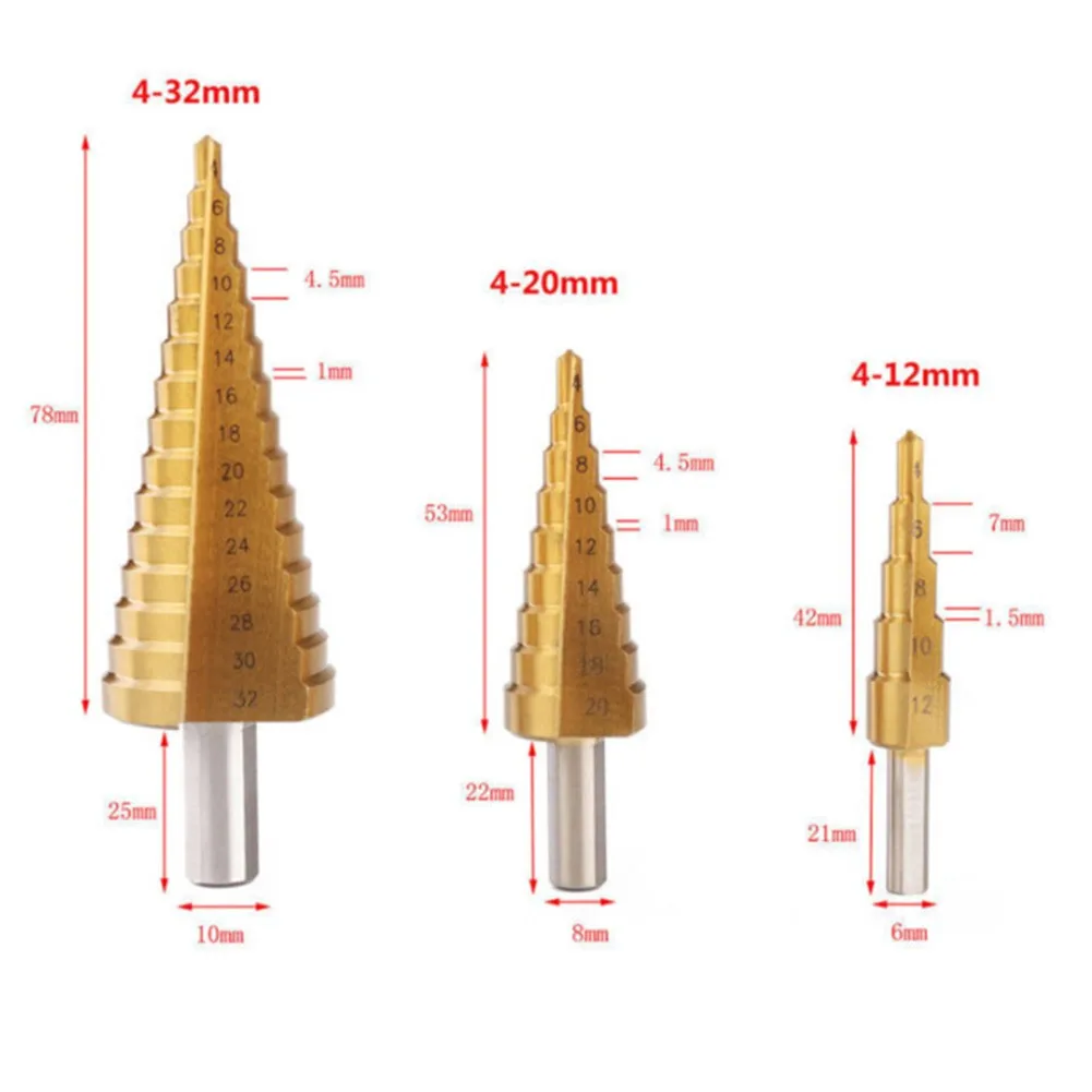 Сверло ступенчатое из быстрорежущей стали с титановым покрытием для дерева и металла, 4-12 мм, 4-20 мм, 4-32 мм