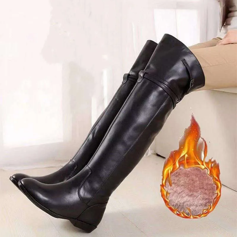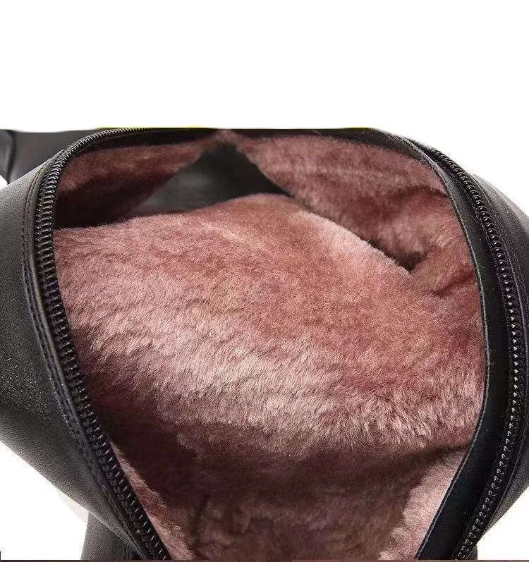 Женские сапоги до колена с плюшевой подкладкой, черные кожаные боев...