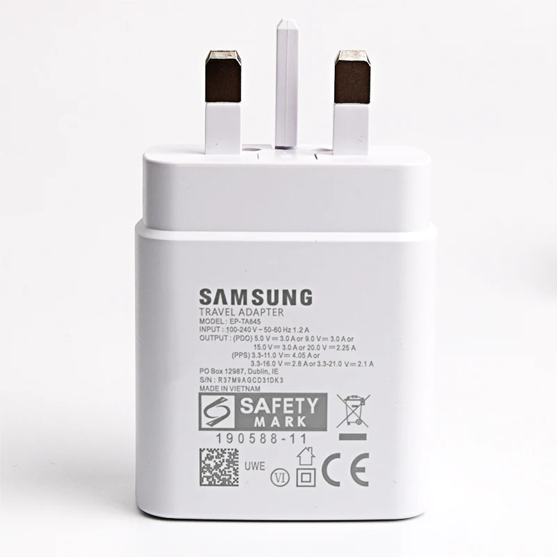 Британский разъем 45 Вт USB зарядное устройство оригинальный Samsung супер быстрая зарядка адаптер PD Тип C кабель для Galaxy S21 S20 Note20 Ultra Plus A11Характеристика:Модель зарядного устройства: EP-TA845Интерфейс: USB Type-C Вход: 100-240 В переменного тока 50-60 Гц 1.2A (PDO): 5,0 V-3.0A или 9V-3.0A или 15,0 V-3.0A или 20,0 V-2.25A (PPS) 3,3 ~ 11,0 V-4.05A или 3,3 ~ 16,0 V-2.8A или 3,3 ~ 21,0 V-2.1A Длина кабелей: 1/1.5 м Характеристики и функции: супер ускоренная зарядка до 45 Вт Используется во всех интерфейсах Type-C-это мобильные телефоны