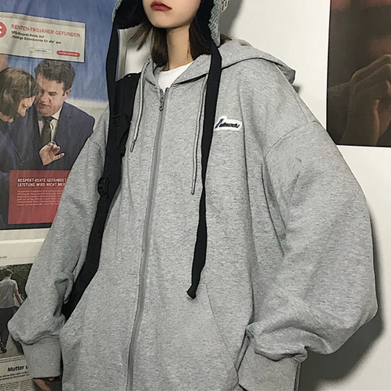 Женские толстовки в стиле Харадзюку, Корейская версия, свободные свитшоты большого размера, винтажный однотонный свитшот с длинным рукавом и капюшоном, пальто на молнии