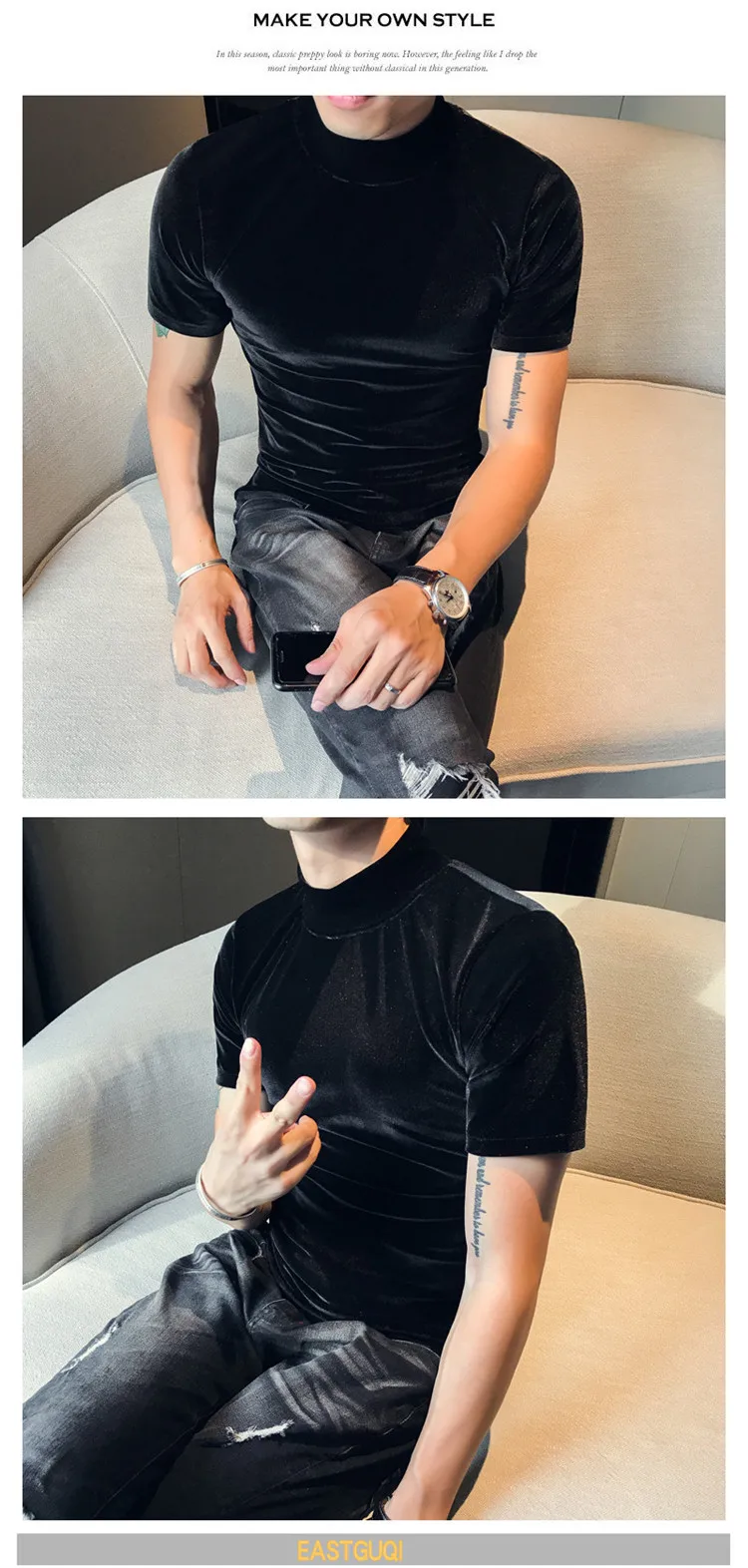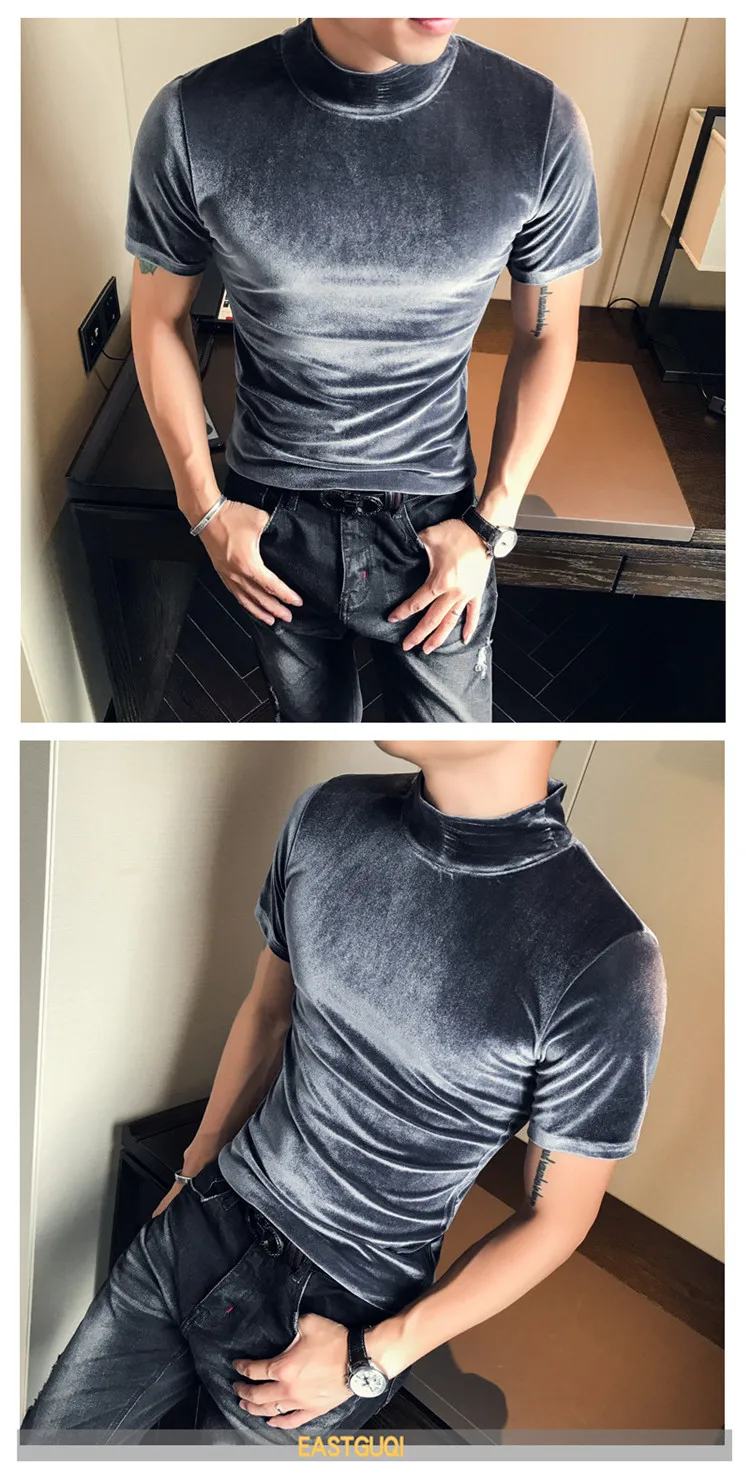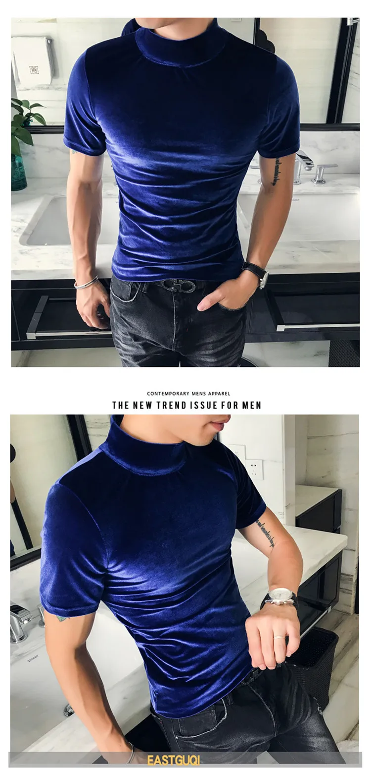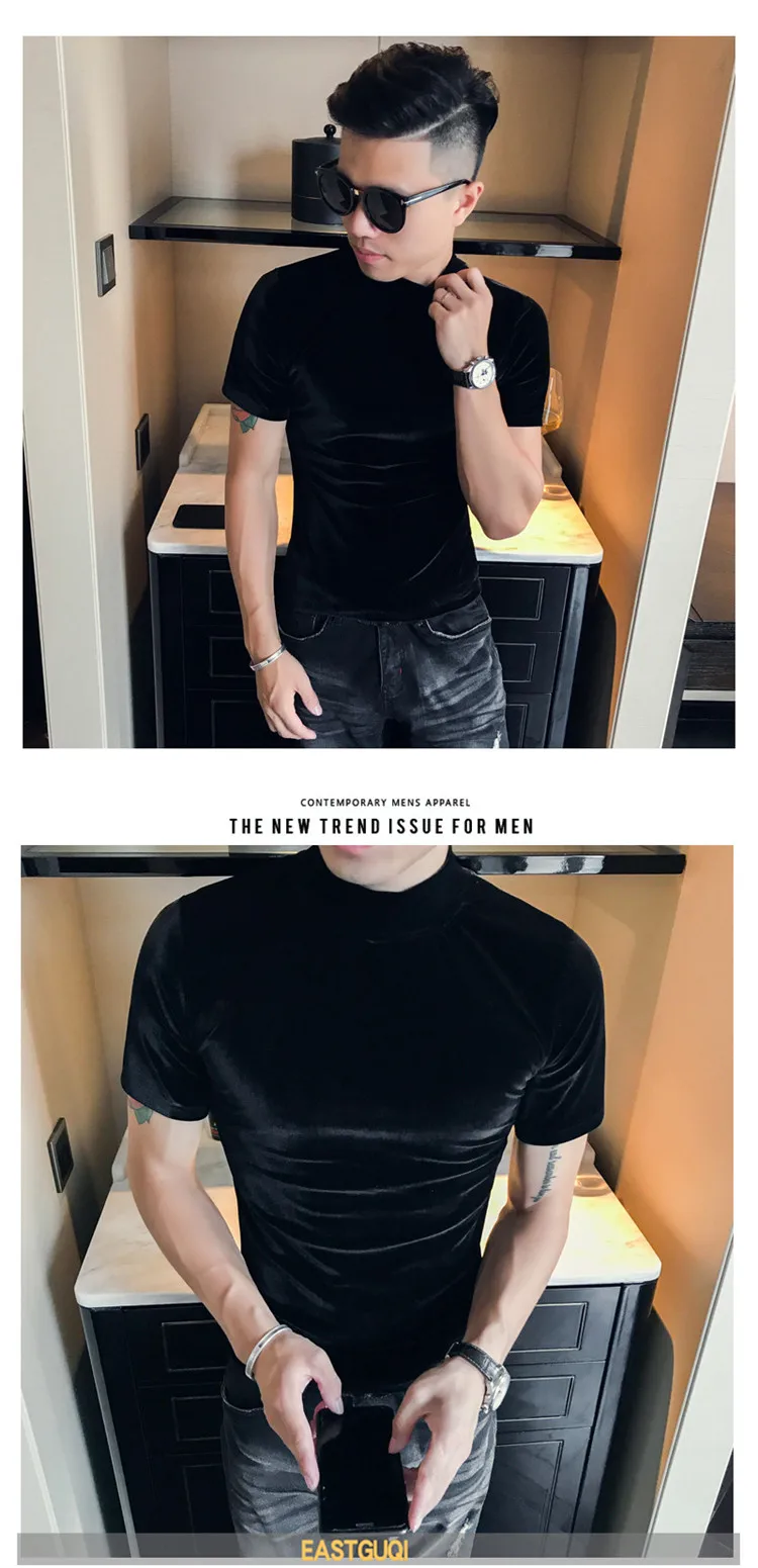 Роскошная мужская футболка с воротником хомут, бархатная однотонная облегающая футболка, однотонная мужская Весенняя облегающая футболка, 4 цвета, Мужская футболка