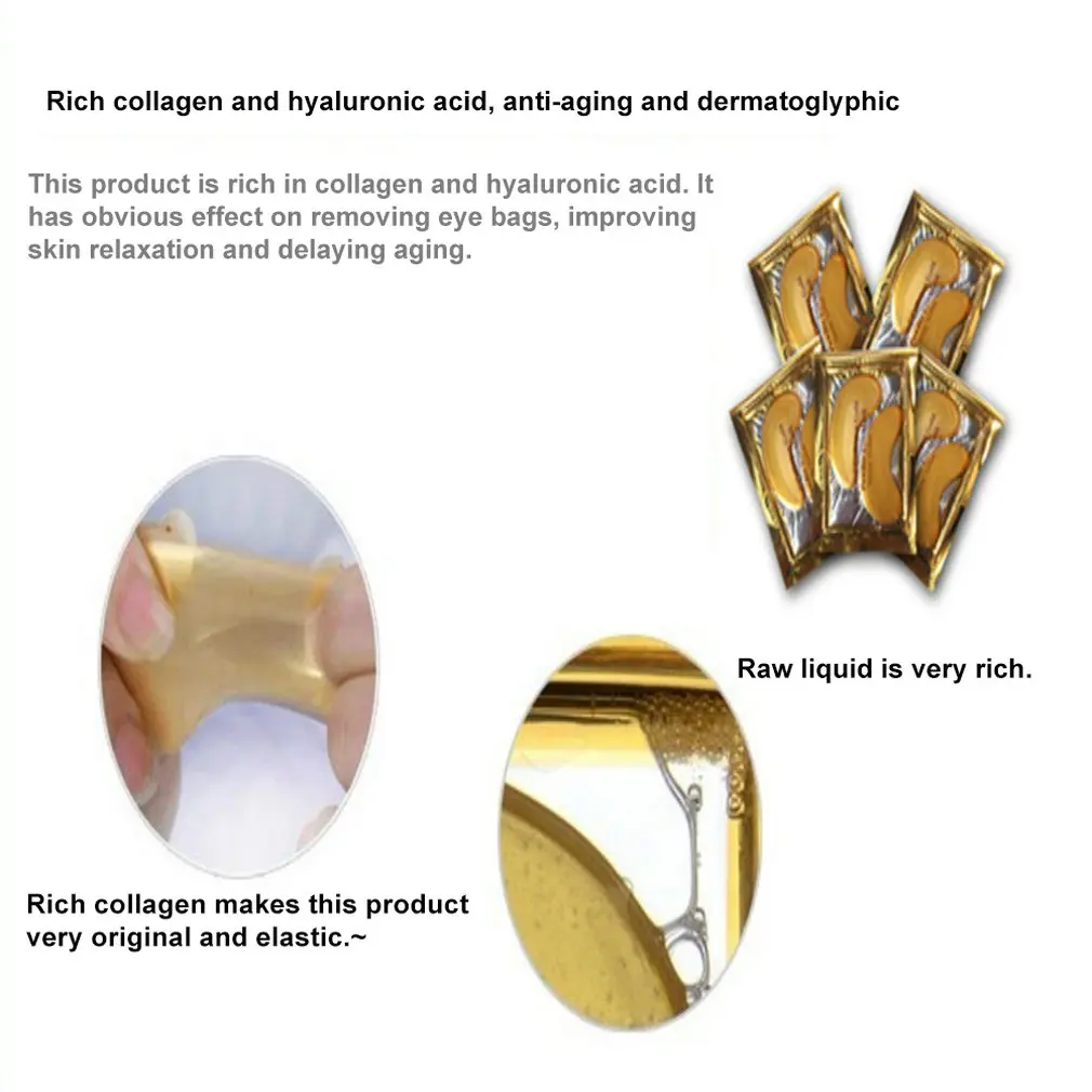 Особенности: 1. Функция: удаляет черные мешки для глаз, увлажняет, отшелушивает, осветляет кожу, оживляет, контролирует масло, увлажняет, глубокое очищение. 2. Гладкость: увлажнение лица. Для преобразования сухой, шелушащейся кожи в гладкую, упругою, здоровую кожу. 3. Оживление и увлажнение: питательный лист, насыщенный влагой, смягчающий свойства для более молодой, здоровой кожи. Характеристики: Цвет: Золотой Состав: Коллаген Срок годности: 36 месяцев