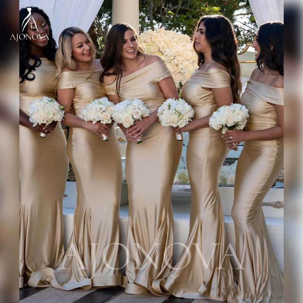 Золотые атласные платья свидетельницы для женщин 2021 Элегантное свадебное вечернее платье с открытыми плечами Русалка подружек невесты женские вечерние платья