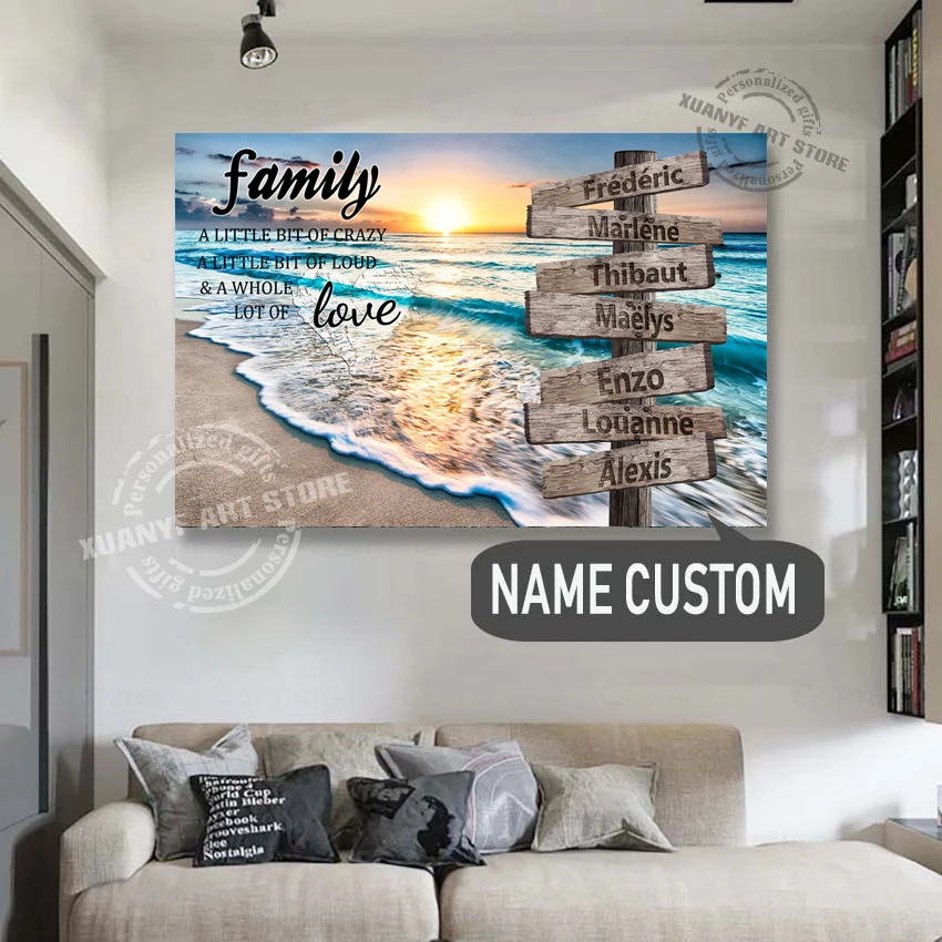 ♥Персонализированная семья заката и пляжа немного сумасшедшая, немного Громкая и полная любовь вдохновляющие цитаты холщовые стены искусства с именем в рамке, пользовательский знак имени