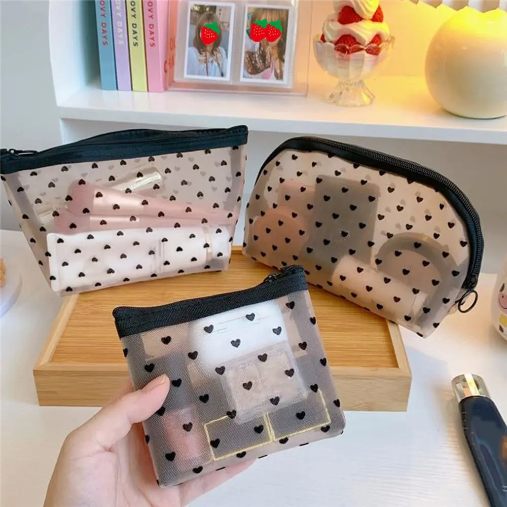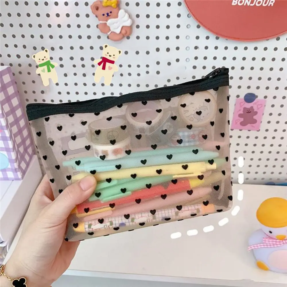 Модный Дорожный держатель, портативный прозрачный сетчатый чехол для ручек с черным сердцем, косметичка, сумки для макияжа, пенал