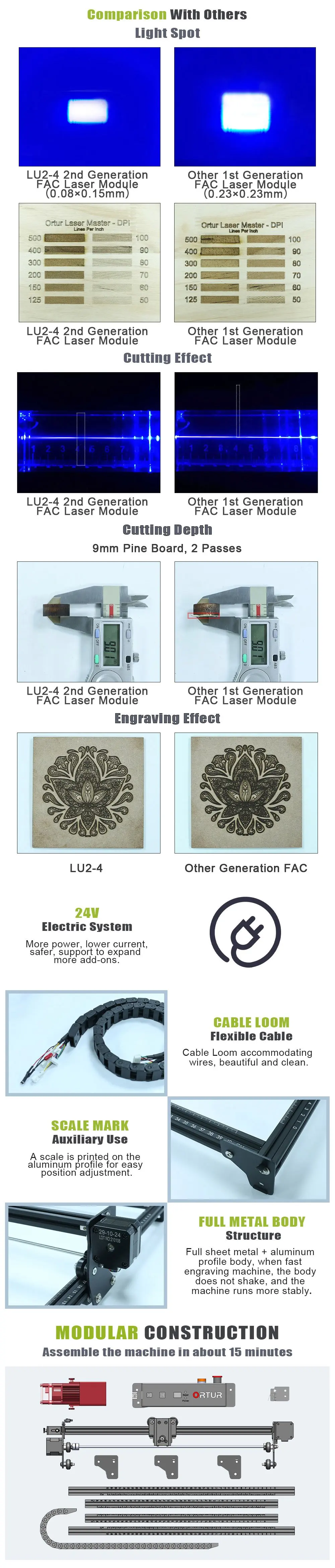 Бренд: OrturНомер модели: Laser Master 2 pro S2Тип: лазерная гравировальная машинаМатериал: алюминий + сталь с порошковым покрытиемМощность лазера: LU2-4 лазерный модуль с сжатым фокусным расстоянием 20 Вт (электрическая мощность: 20 Вт, Сила света: 5000-5500 МВт)Дальность достижения лазера: 445 ± 5 нмПитание: адаптер питания 24 В 2 А