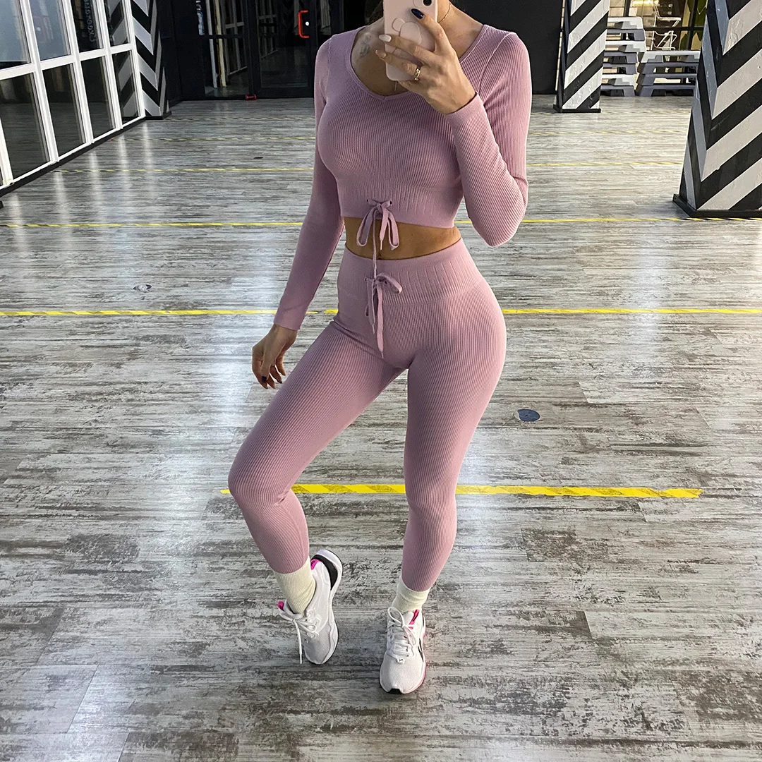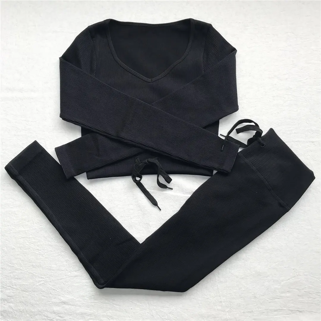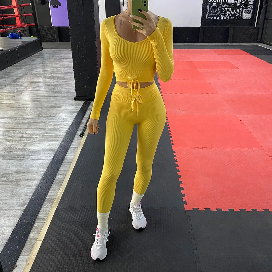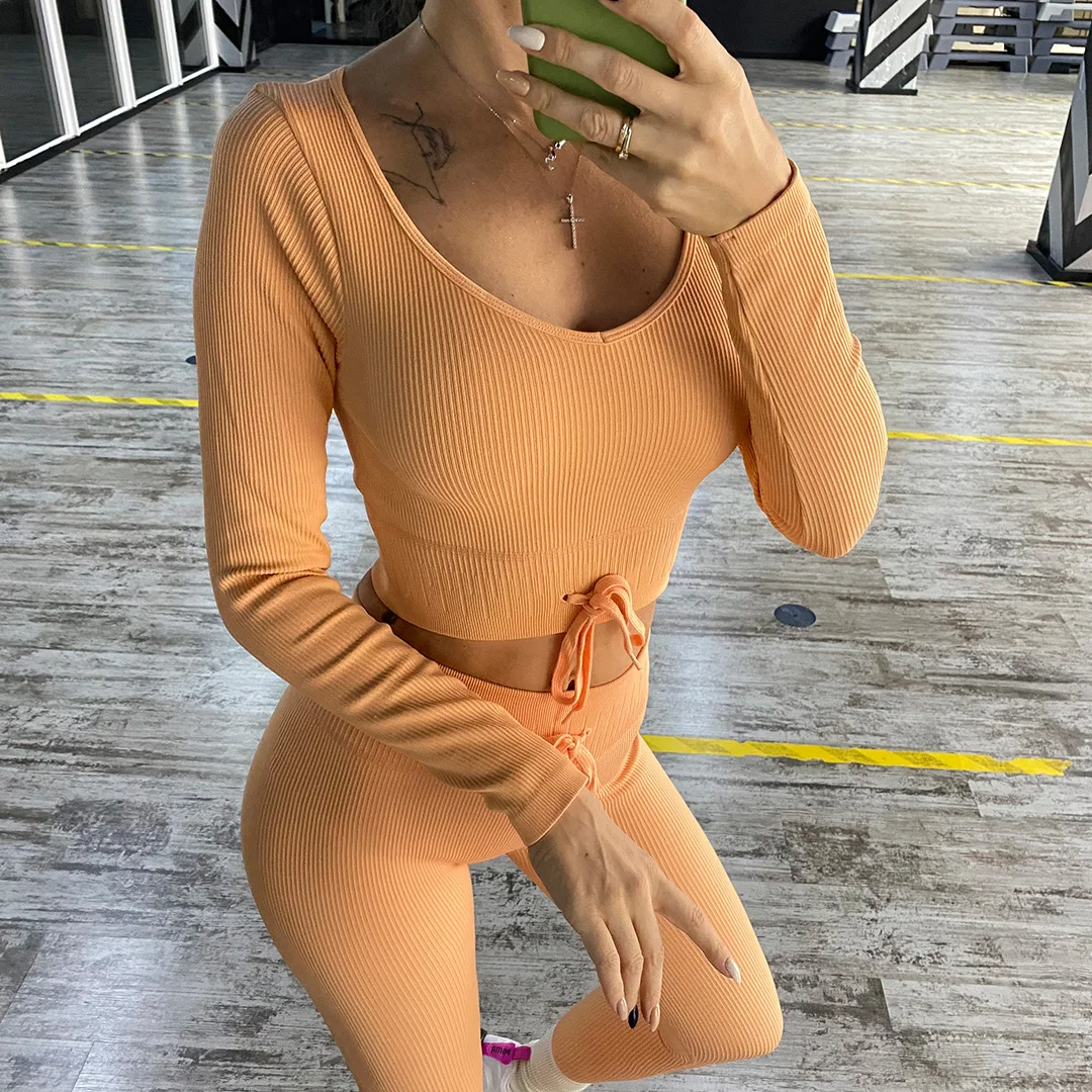 Комплект для йоги Женская спортивная одежда Топ с длинным рукавом Леггинсы с высокой талией на шнуровке спортивные брюки Одежда для тренировок одежда для спортзала A064TP