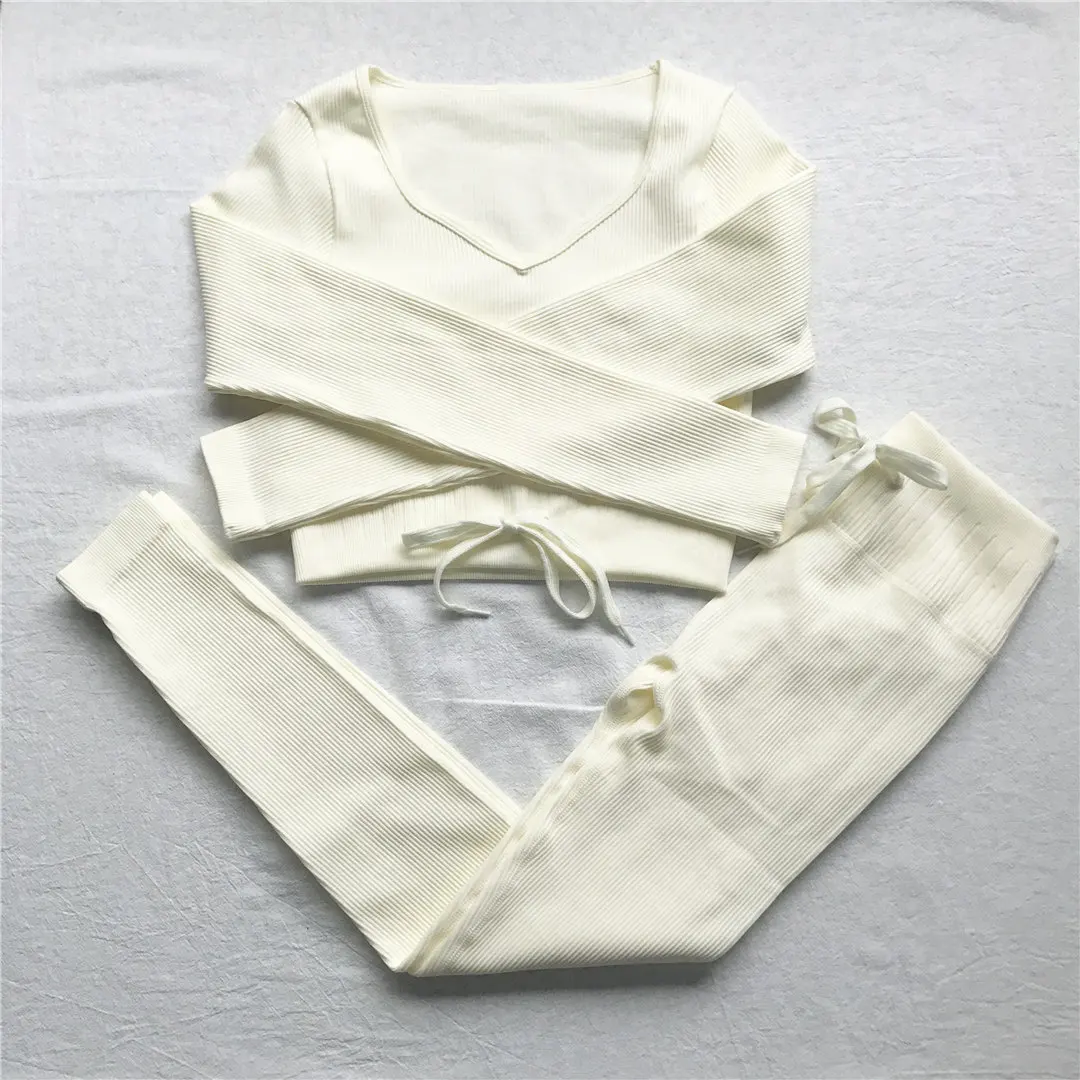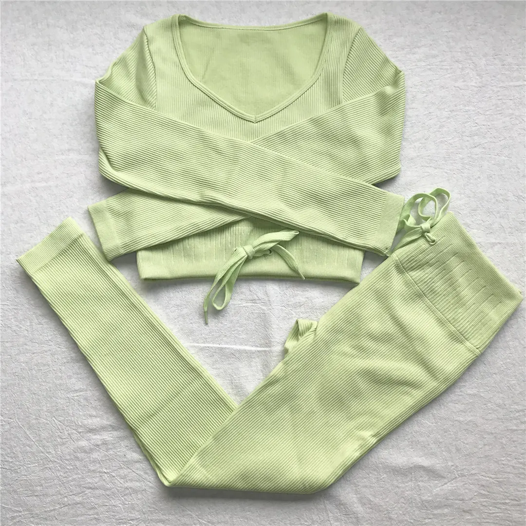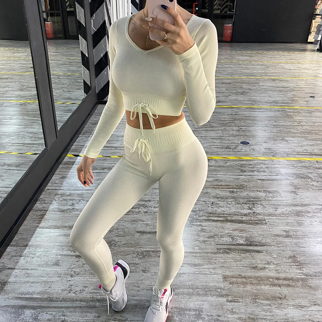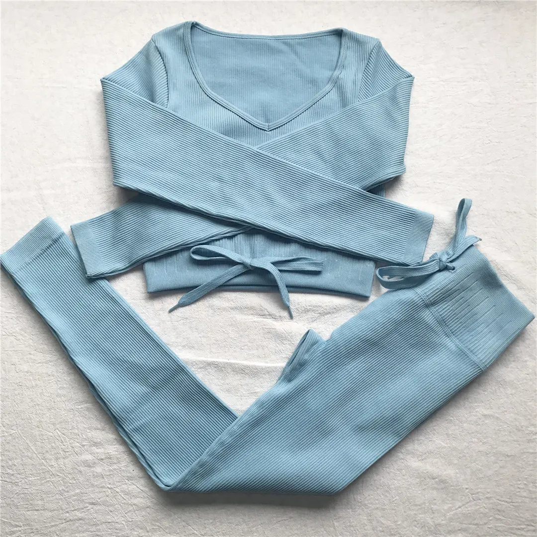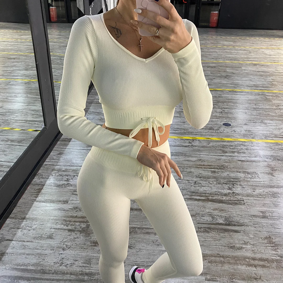 Комплект для йоги Женская спортивная одежда Топ с длинным рукавом Леггинсы с высокой талией на шнуровке спортивные брюки Одежда для тренировок одежда для спортзала A064TP