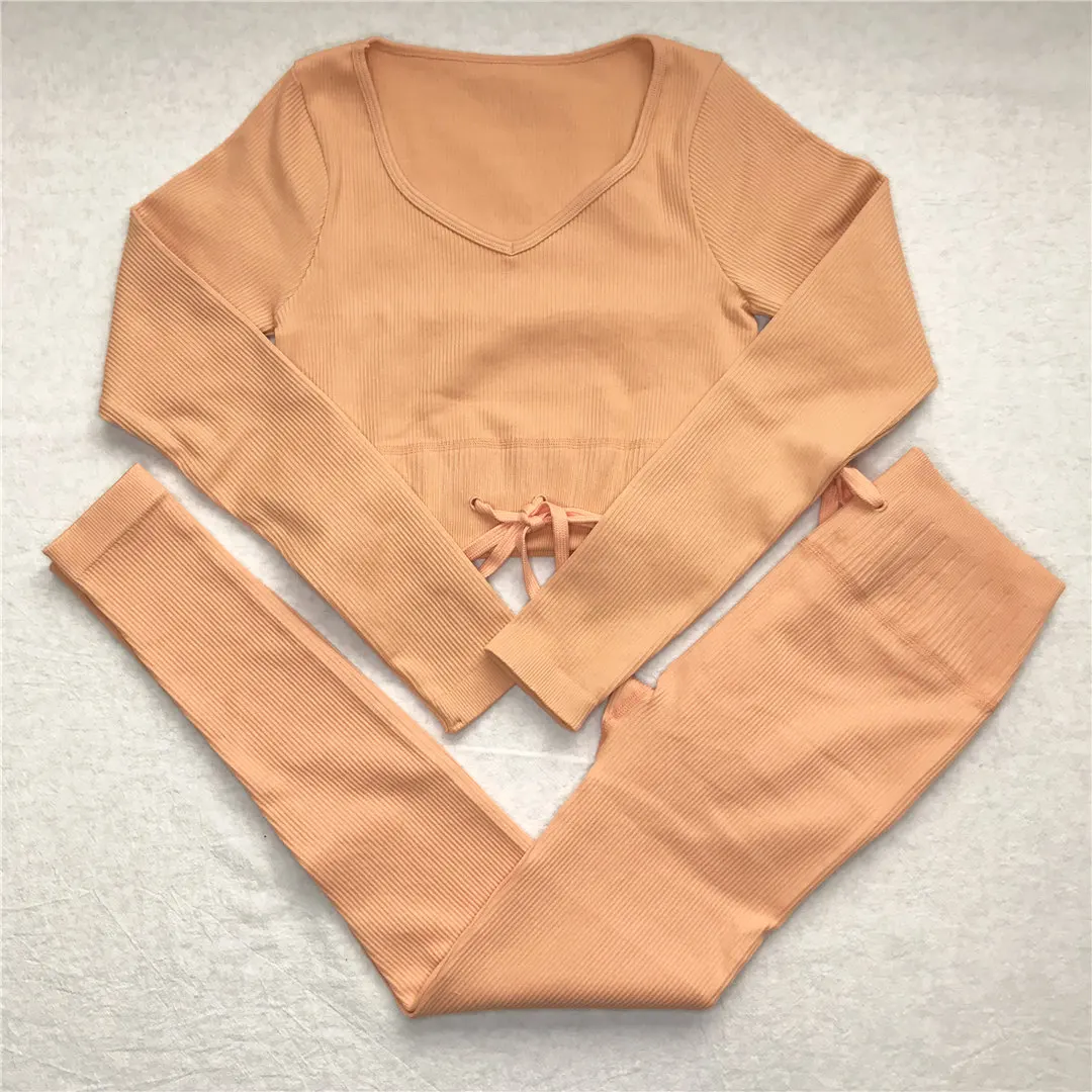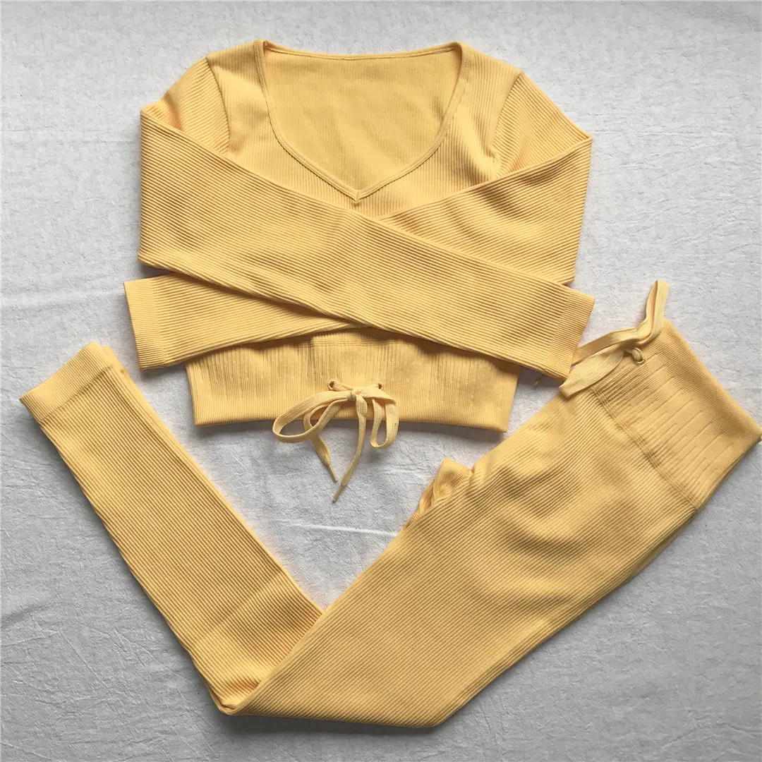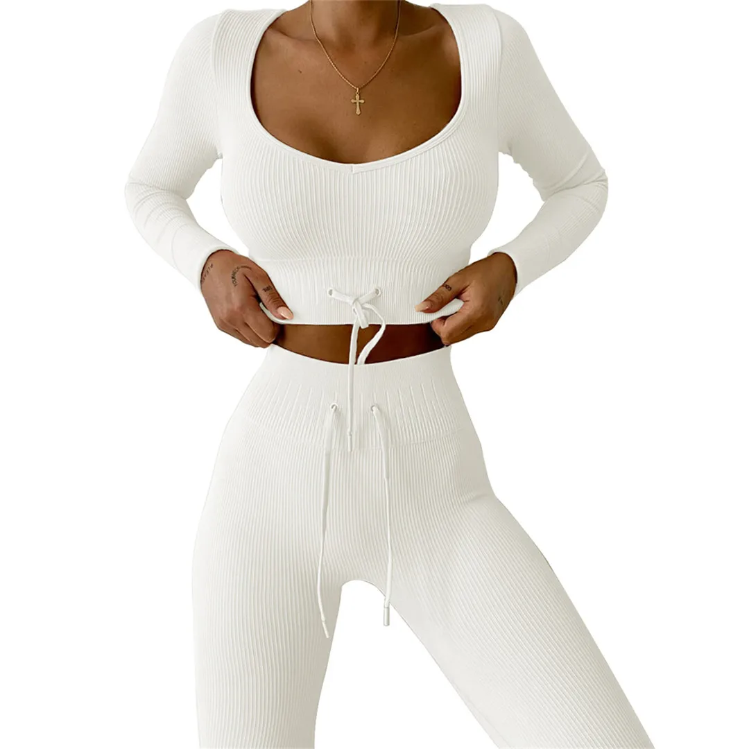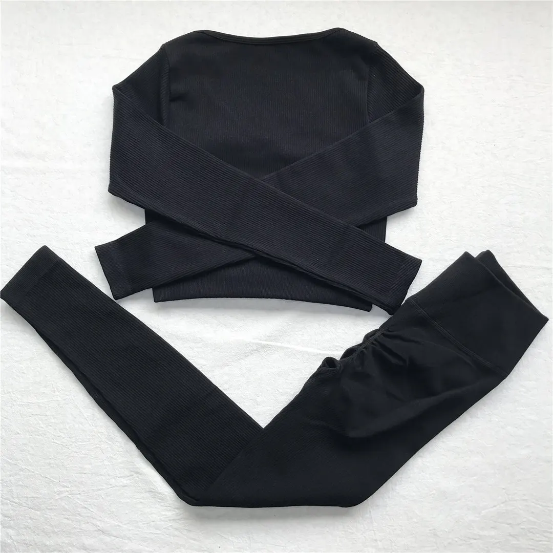Комплект для йоги Женская спортивная одежда Топ с длинным рукавом Леггинсы с высокой талией на шнуровке спортивные брюки Одежда для тренировок одежда для спортзала A064TP