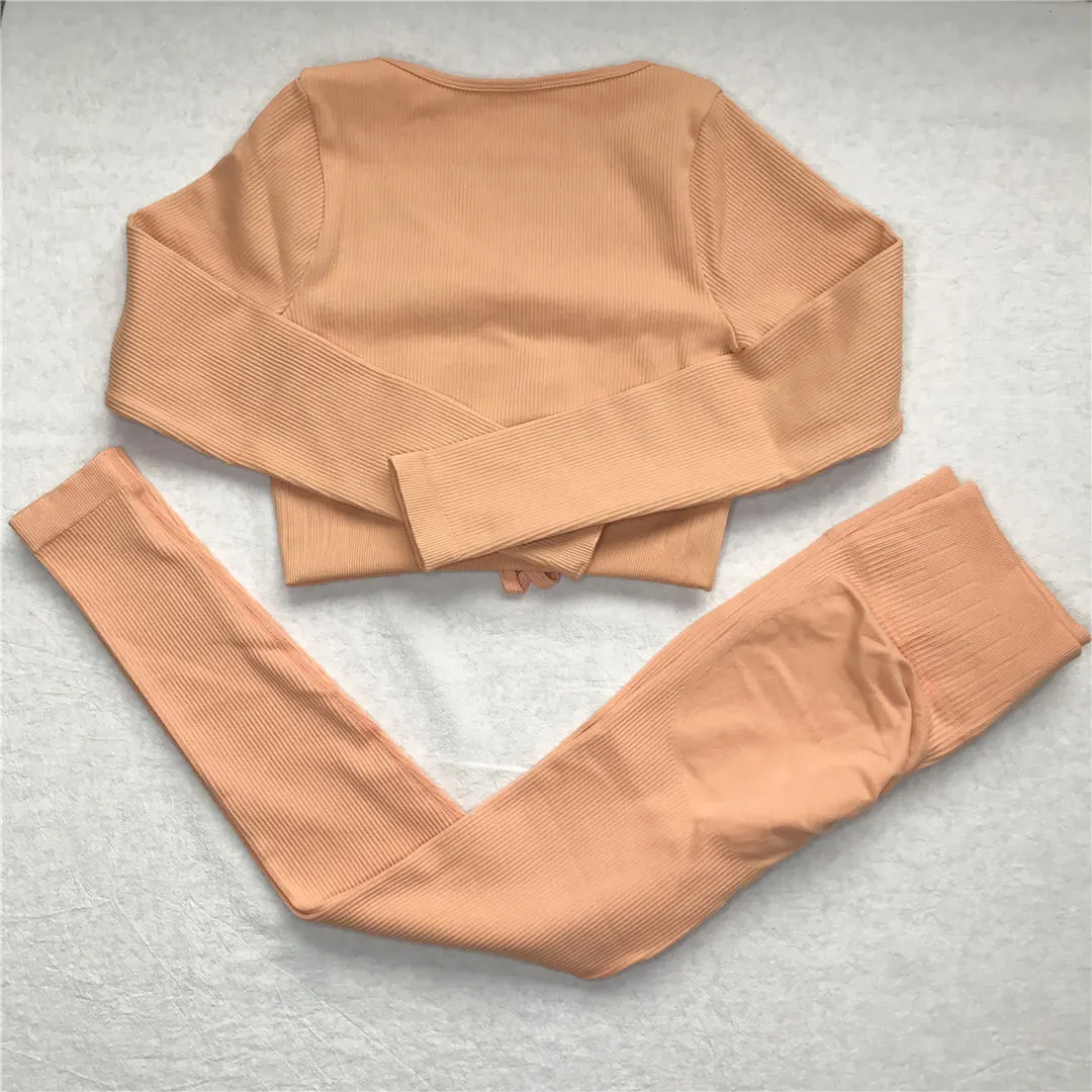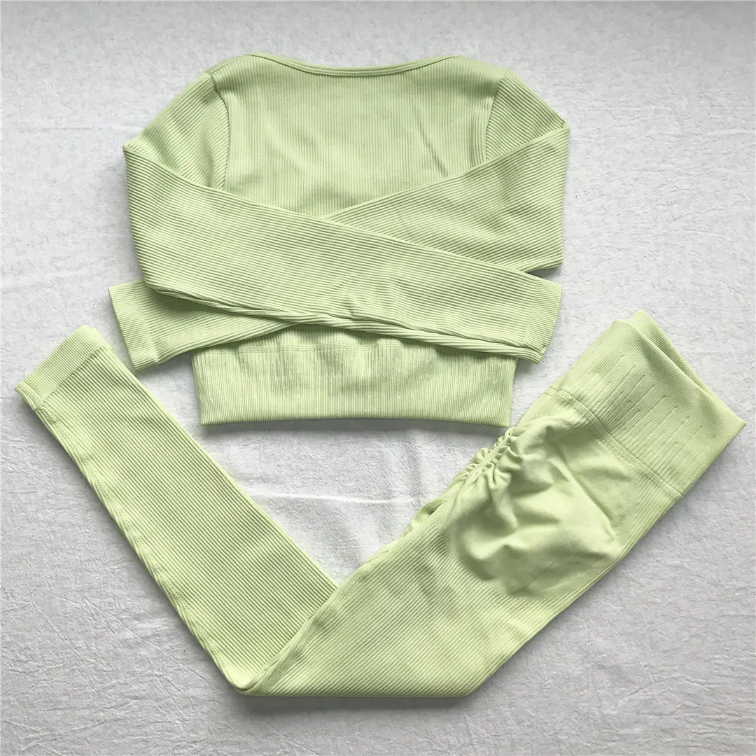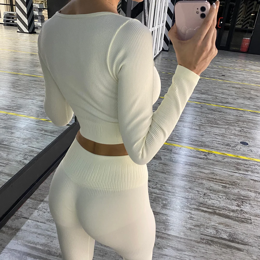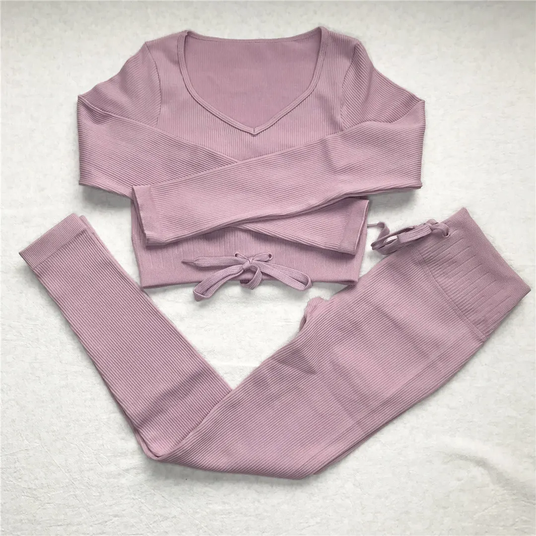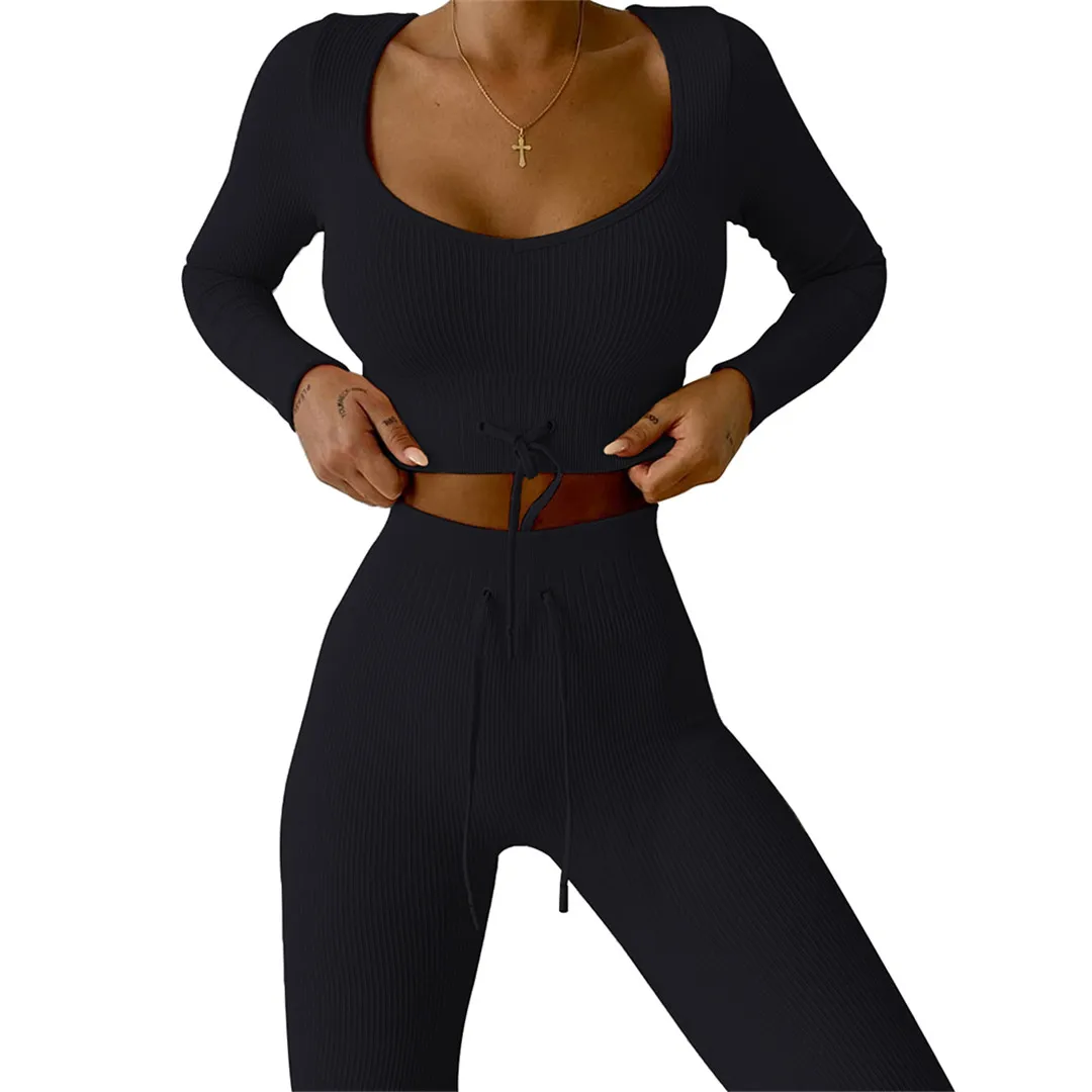 Комплект для йоги Женская спортивная одежда Топ с длинным рукавом Леггинсы с высокой талией на шнуровке спортивные брюки Одежда для тренировок одежда для спортзала A064TP