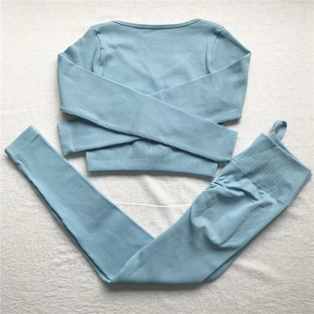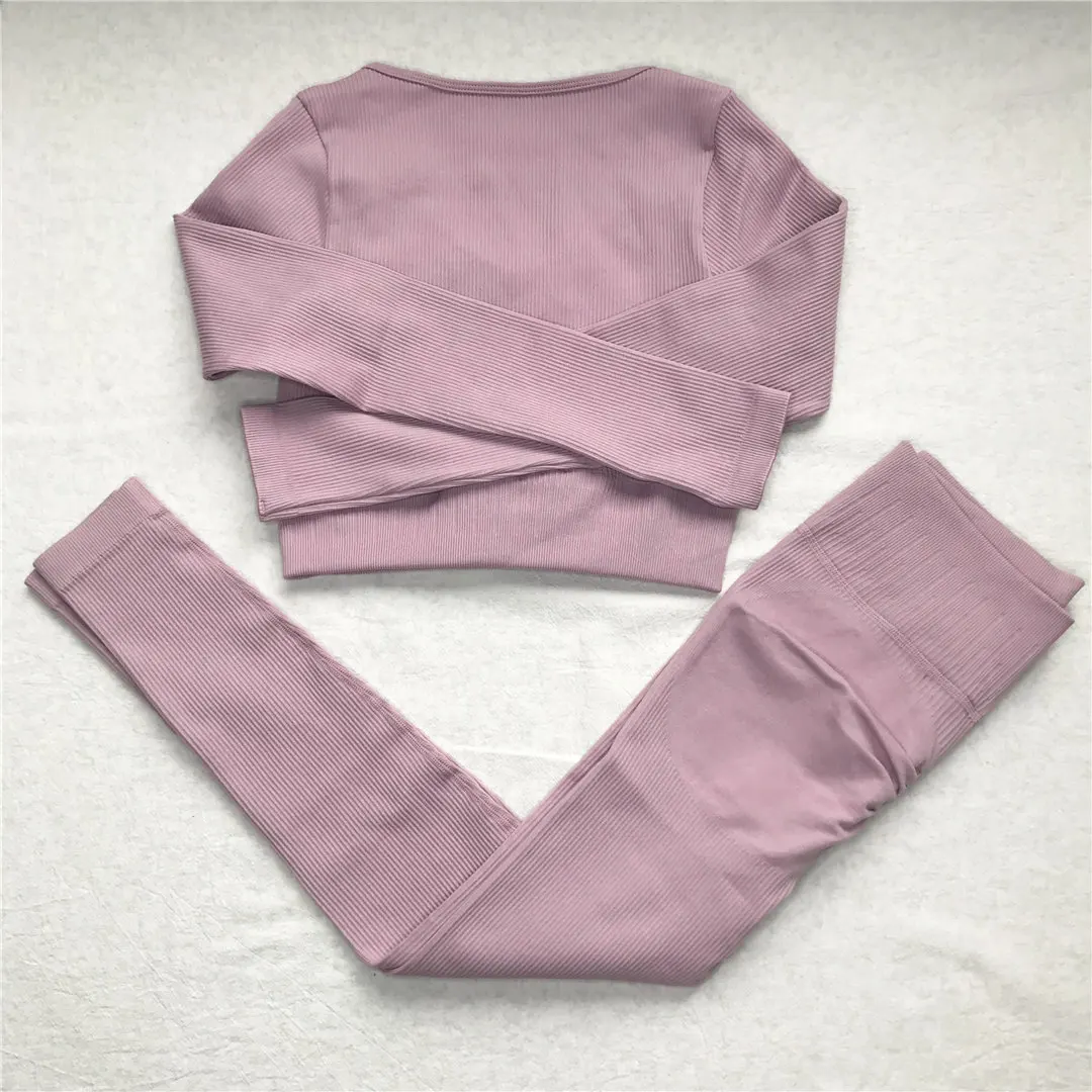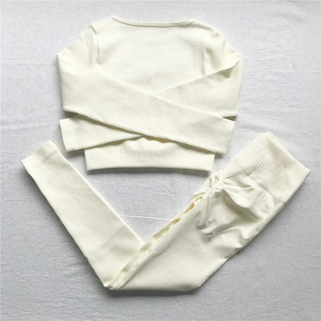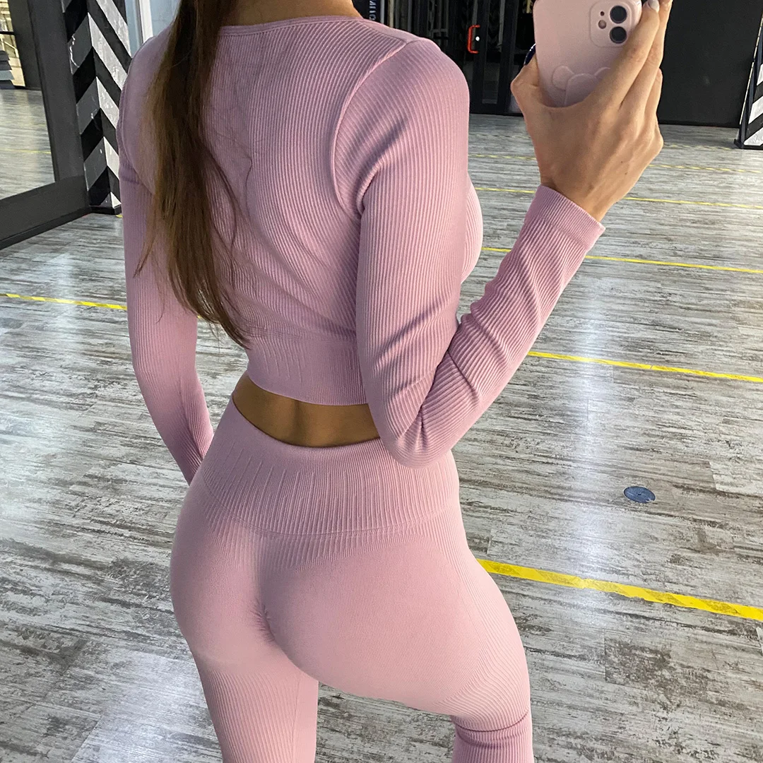 Комплект для йоги Женская спортивная одежда Топ с длинным рукавом Леггинсы с высокой талией на шнуровке спортивные брюки Одежда для тренировок одежда для спортзала A064TP