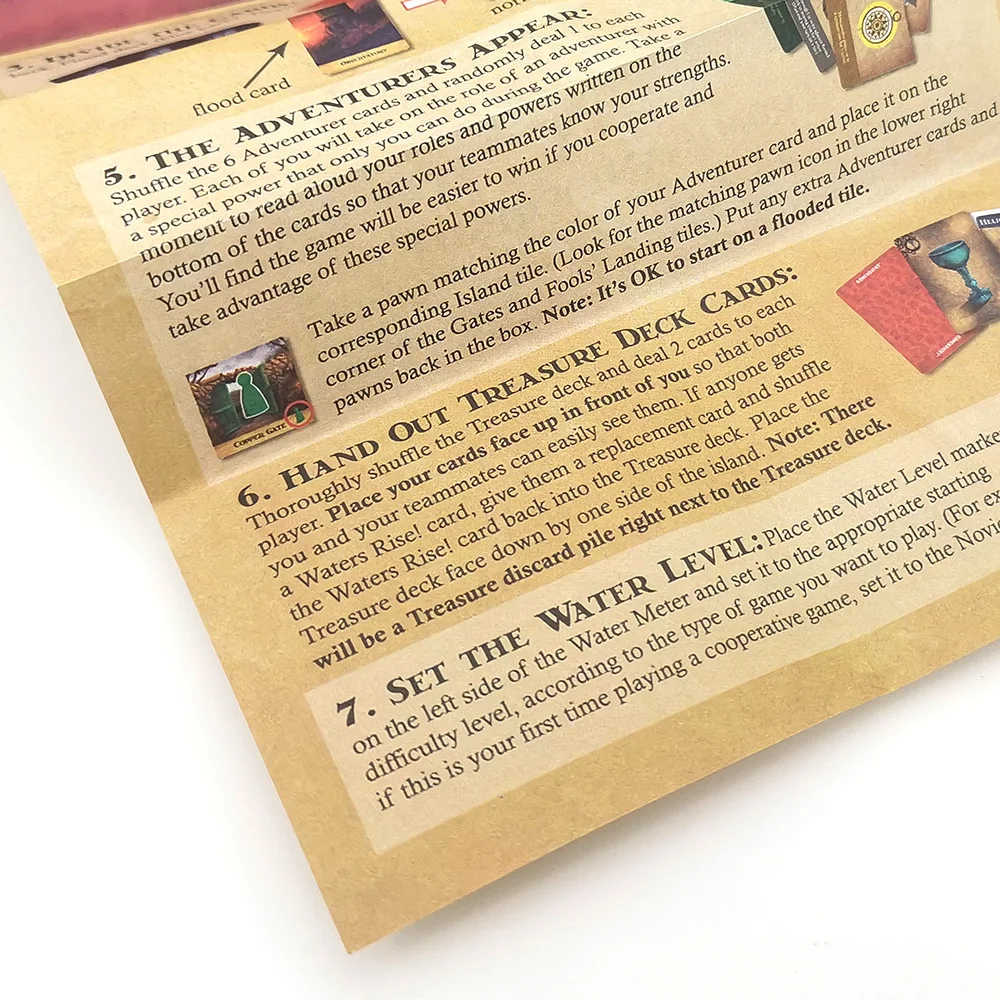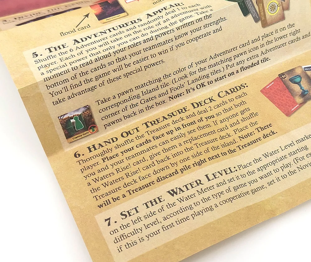 58 игральных карт + 24 плитки острова + 6 пешек + 4 фигурки сокровищ + 1 маркер уровня воды + 1 счетчик воды + инструкция + черная коробка