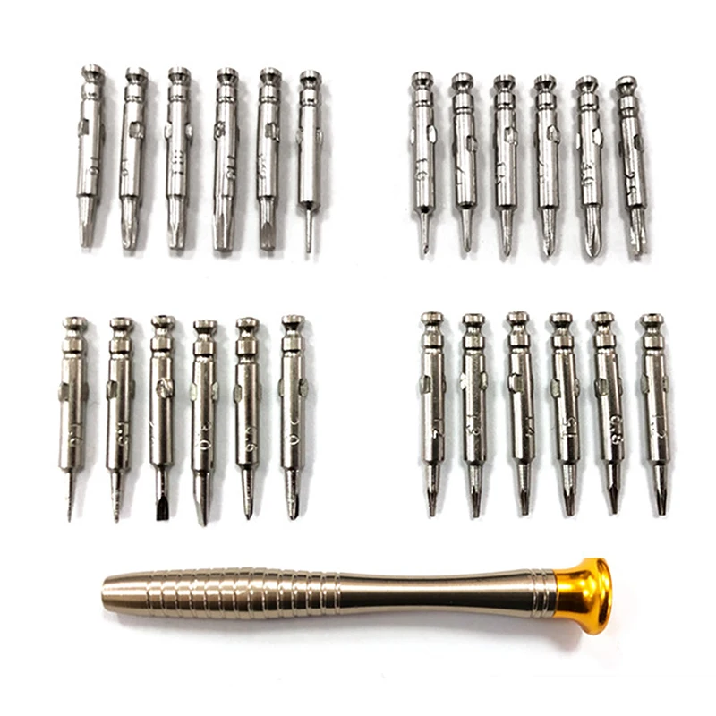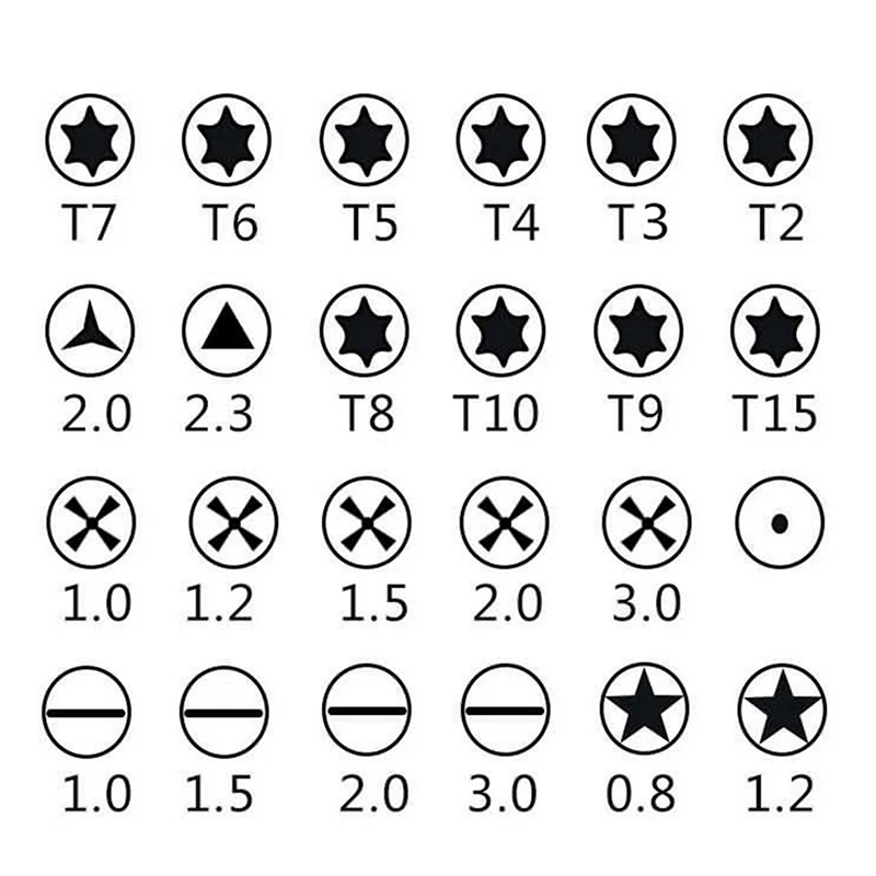 Детали:Набор отверток 25 в 1, включая:Шестигранная отвертка (10 шт.): T2 T3 T4 T5 T6 T7 T8 T9 T10 T15Отвертка Phillips (6 шт.): PH0000, PH000, PH00, PH0, PH1(2 шт.)Прямая отвертка (4 шт.): 1,0, 1,5, 2,0, 3,0,Отвертка Pentacle (2 шт.): 0,8, 1,2Треугольная отвертка (1 шт.): 2,3Отвертка (1 шт.): 1,0Ручка отвертки (1 шт.)