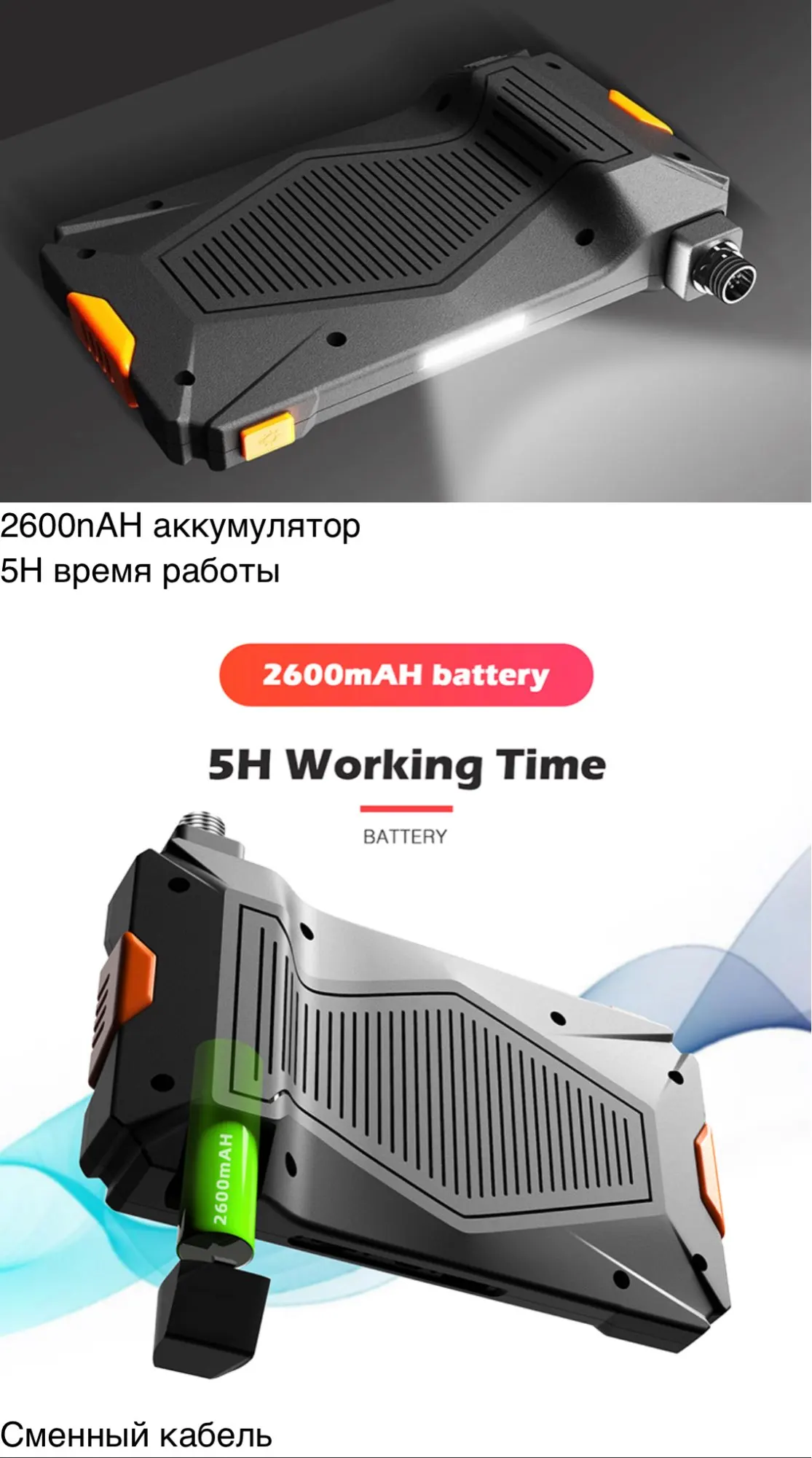 Встроенный аккумулятор 2600 мАч в течение 5-7 часов работы.