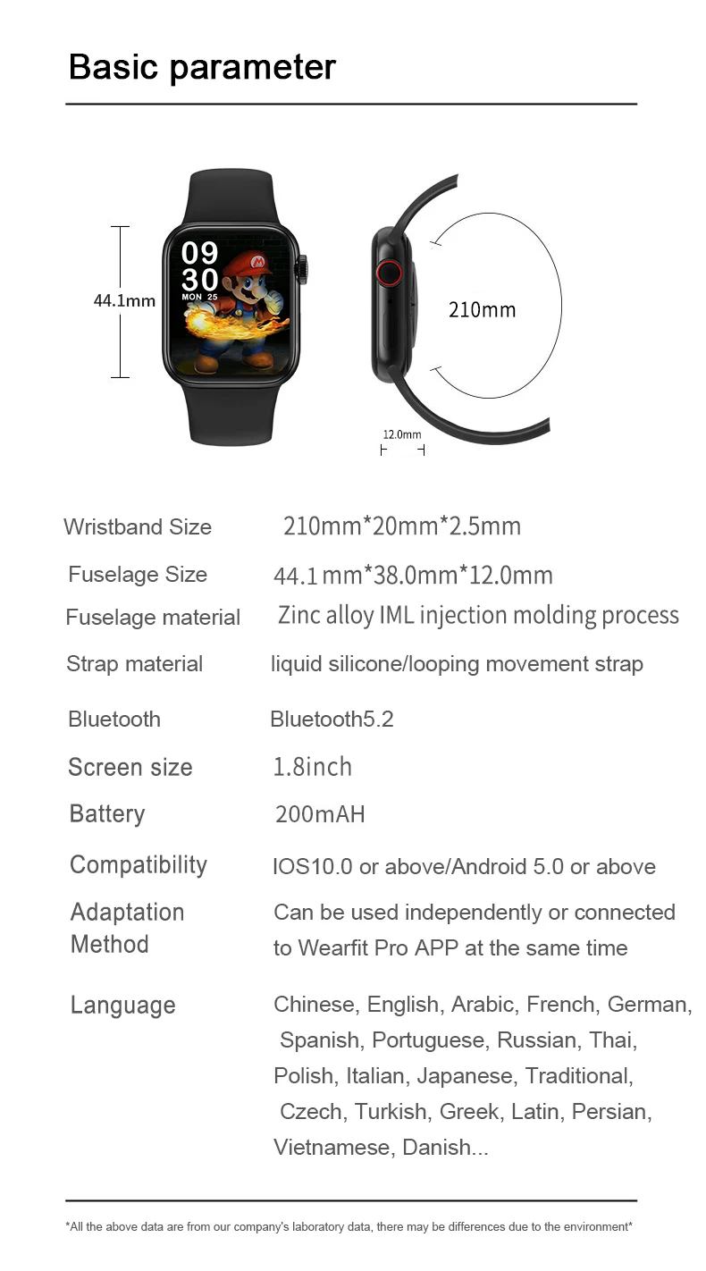 1. Системные требования: android5.0 + / ios10.0 +2. Главный чип: Hs66213. Память браслета: 128 м4. Синий зуб для звонков: AB5376A25. Версия Bluetooth: 5,26. Чип сердечного ритма: SC7R307. Экран Дисплей: 1,75 inch-большая округлая Экран8. Емкость аккумулятора: 200 мАч9. Время использования: около 1-3 дней10. Метод кнопки: сенсорный экран11. Двигатель: круговой двигатель12. Порт зарядки: Беспроводная зарядка13. Уровень водонепроницаемости: IP6814. Датчик: g-сенсор 3 оси15. Местный циферблат: 516. Рынок циферблата: 50 +17. Стиль меню: 318. Приложение: WearFit pro