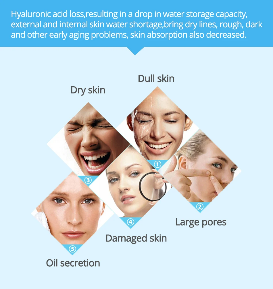 Потеря гиалуроновой кислоты, что приводит к падению емкости для хранения воды. xternal и внутренняя вода для кожи. Br ing сухие линии, грубые, темные и другие проблемы раннего старения, поглощение кожи также уменьшилось.