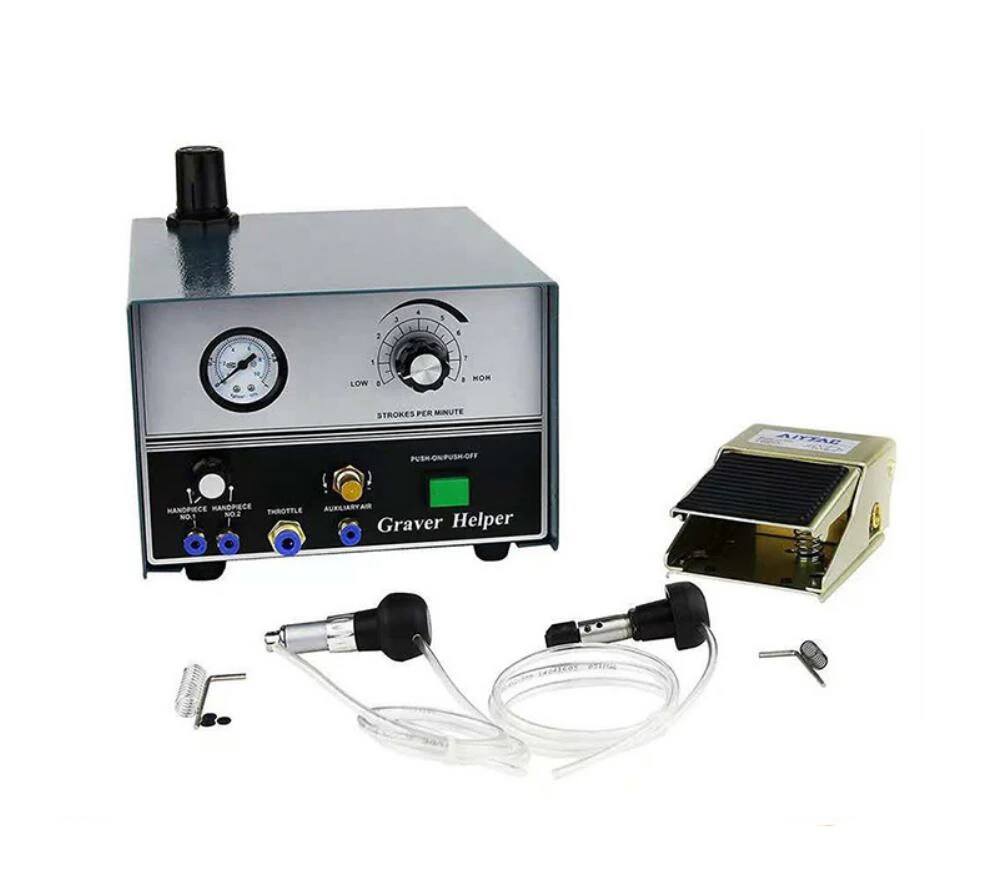 Гравировальная машина HH-G01 имеет соединения для двух ударных наконечников и вспомогательное воздушное соединение для других воздушных инструментов, включая ротационный наконечник. Две наконечники и управление одной ногой поставляются с гравировальной машиной HH-G01