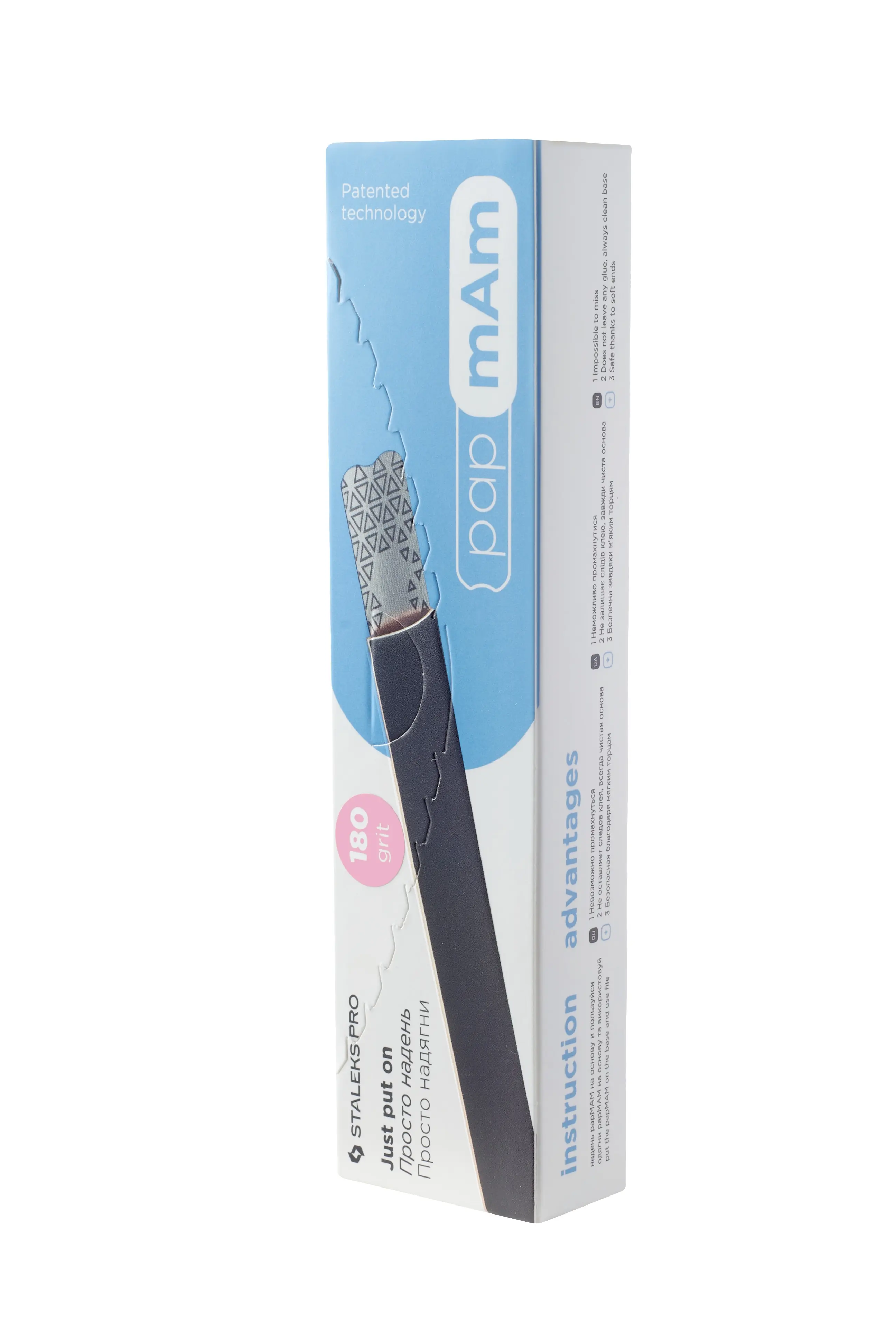 • Бесклеевые файлы papmAm надеваются на металлическую основу как чехол, полностью закрывающие ее с обоих сторон и торцов. Такой принцип крепления даст мастеру еще больше уверенности в своих движениях и обезопасит клиента от случайных порезов. А основа всегда будет оставаться чистой, без остатков клея после снятия сменного файла.