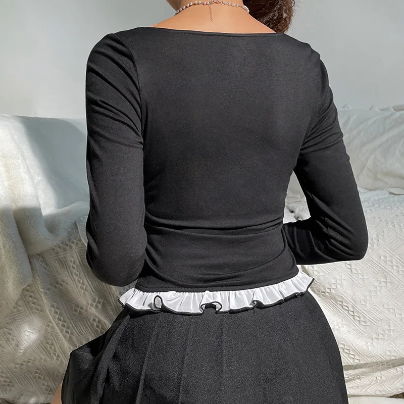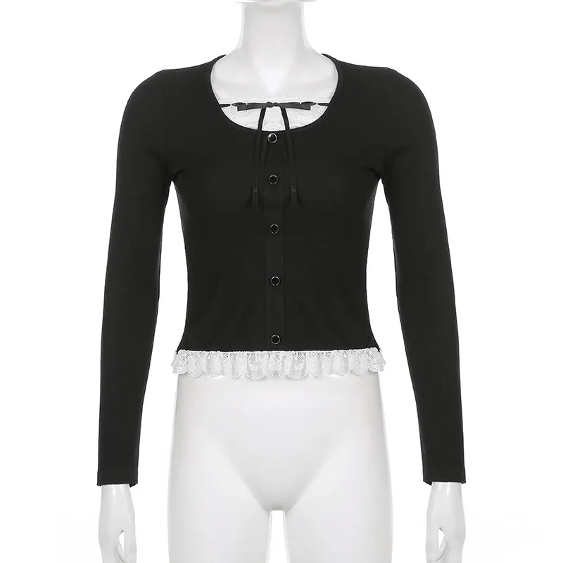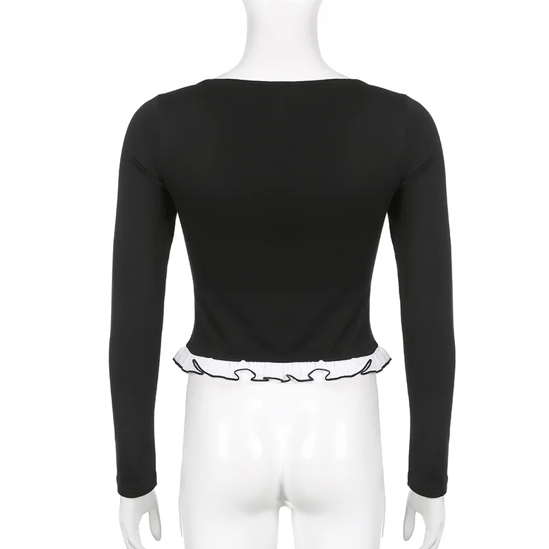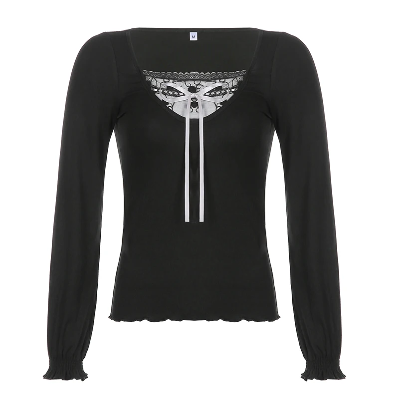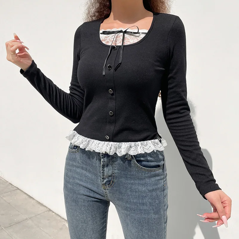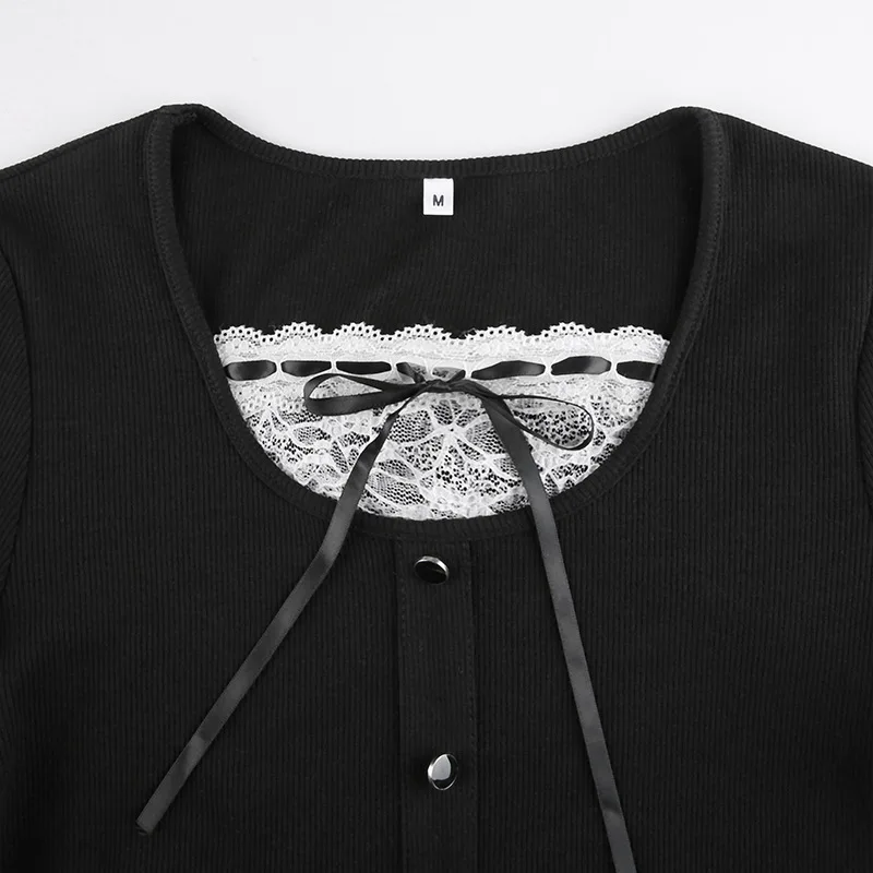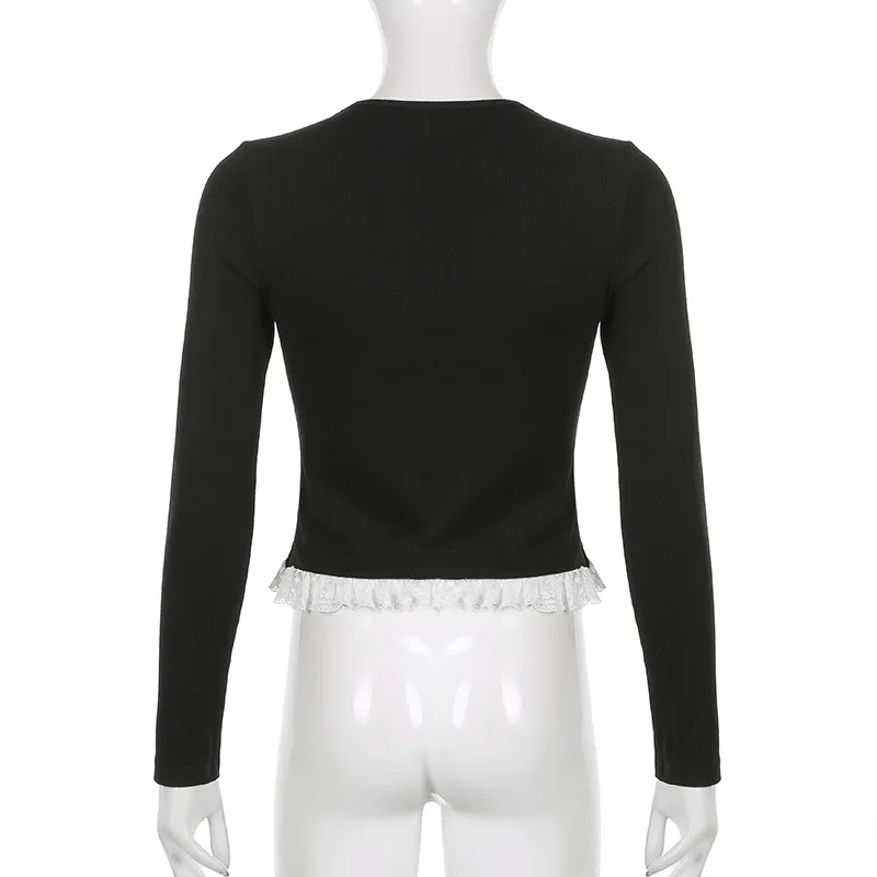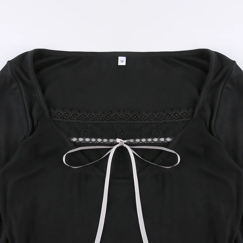 Y2K Кружевная футболка с отделкой осенне-весенняя одежда Harajuku черный укороченный топ с бантом женские уличные сексуальные обтягивающие Футболки с длинным рукавом