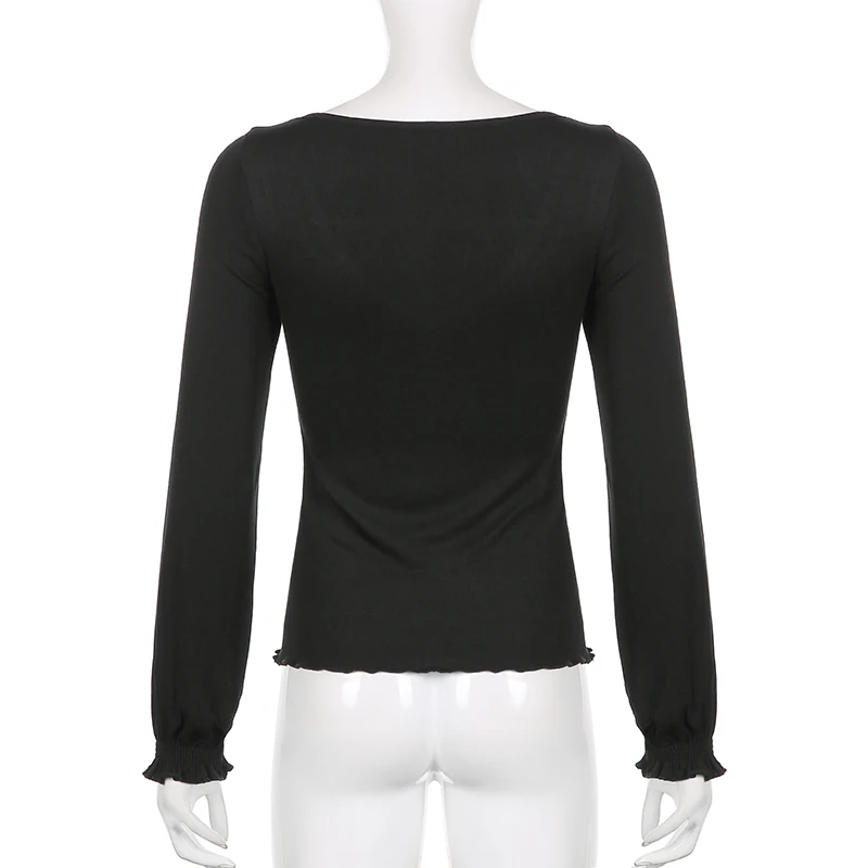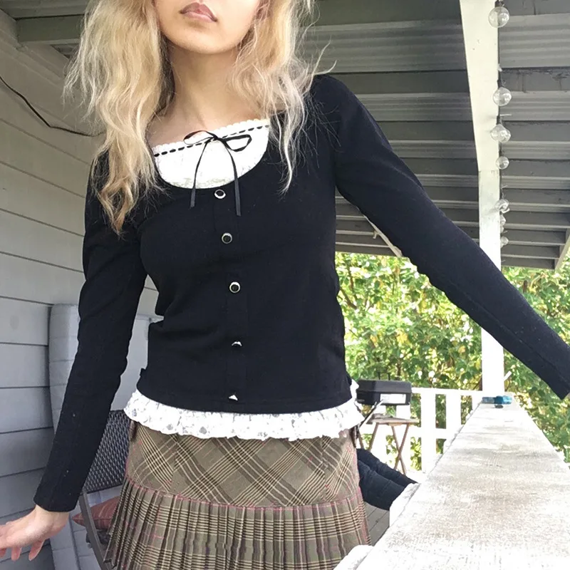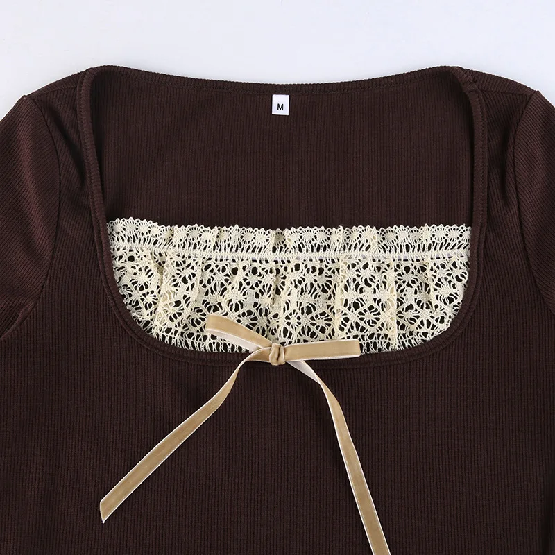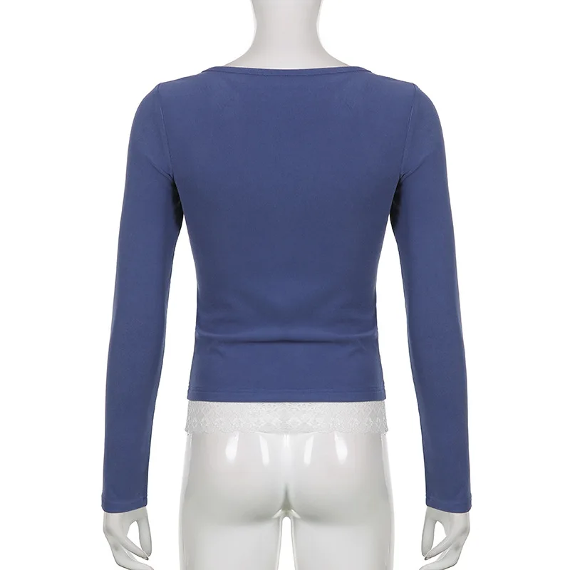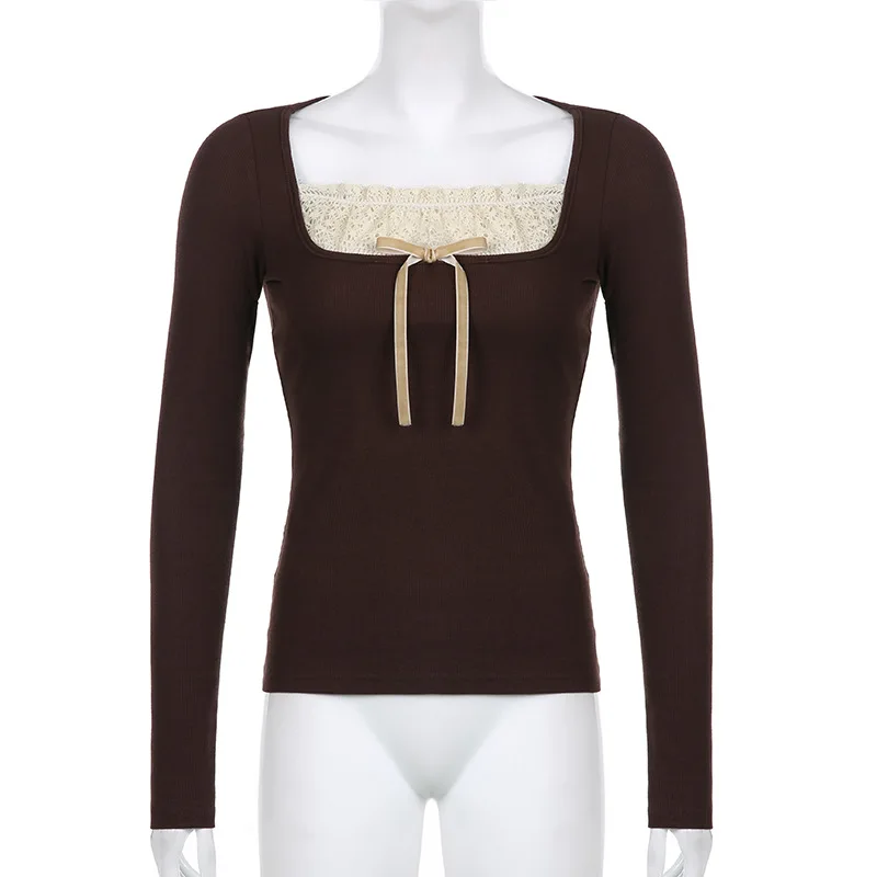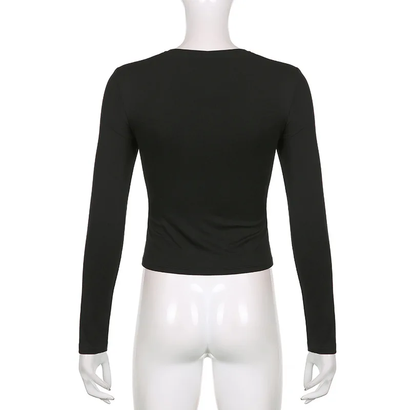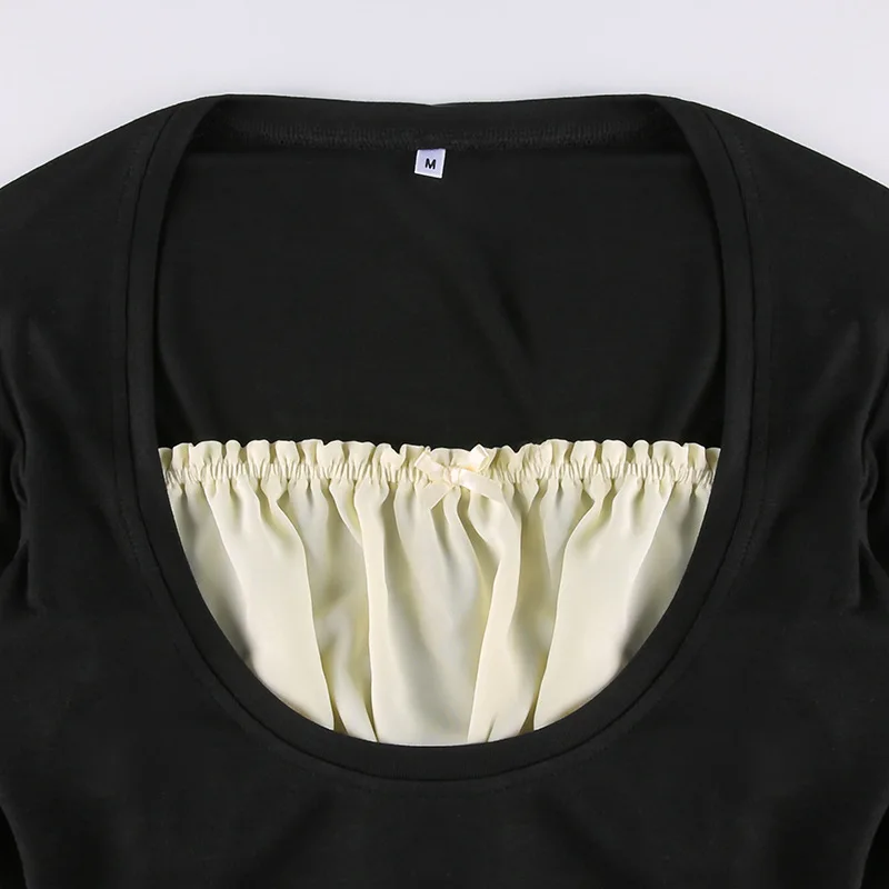 Y2K Кружевная футболка с отделкой осенне-весенняя одежда Harajuku черный укороченный топ с бантом женские уличные сексуальные обтягивающие Футболки с длинным рукавом