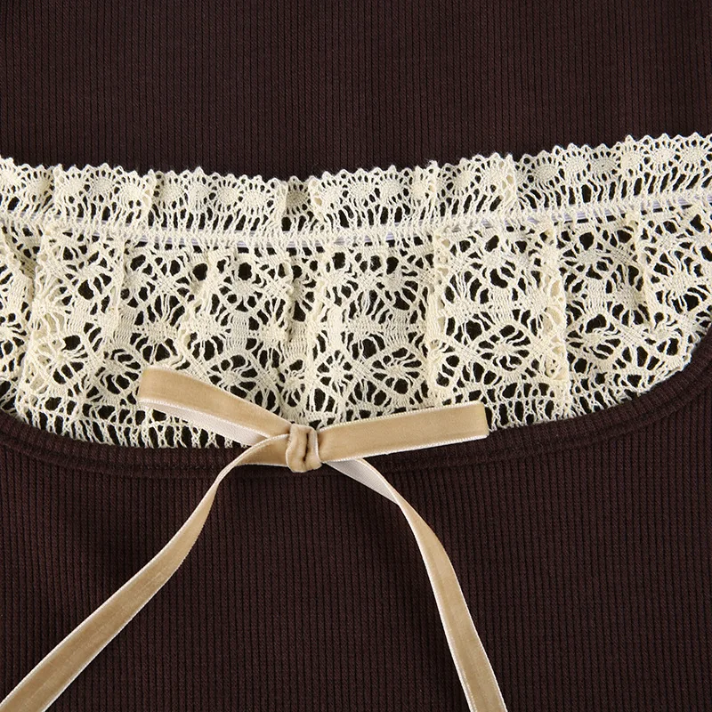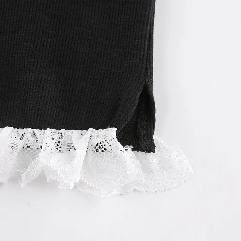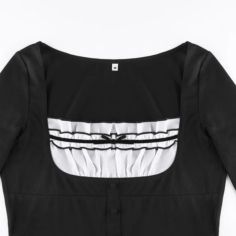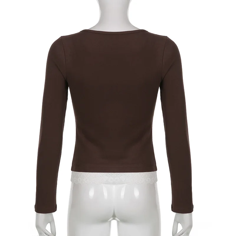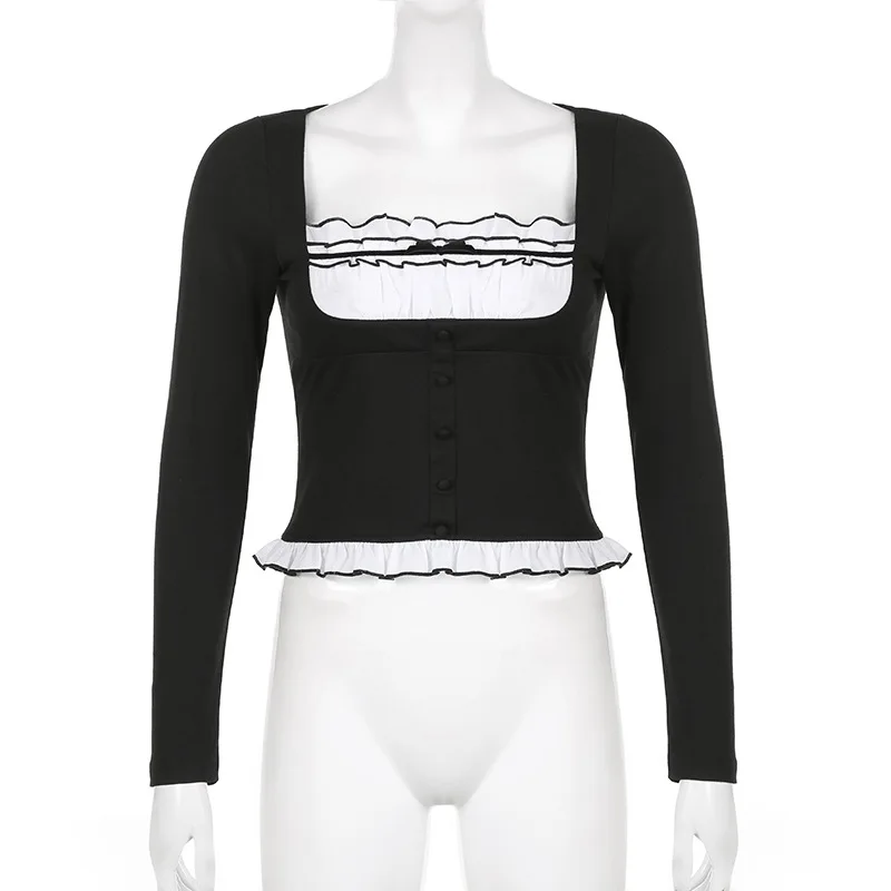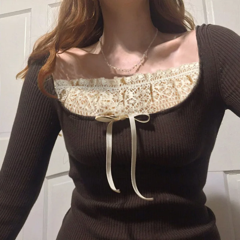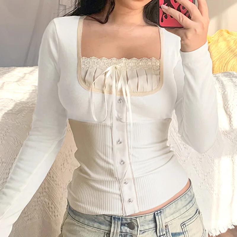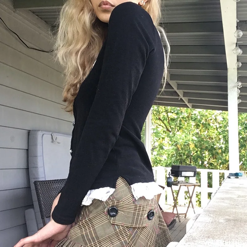 Y2K Кружевная футболка с отделкой осенне-весенняя одежда Harajuku черный укороченный топ с бантом женские уличные сексуальные обтягивающие Футболки с длинным рукавом