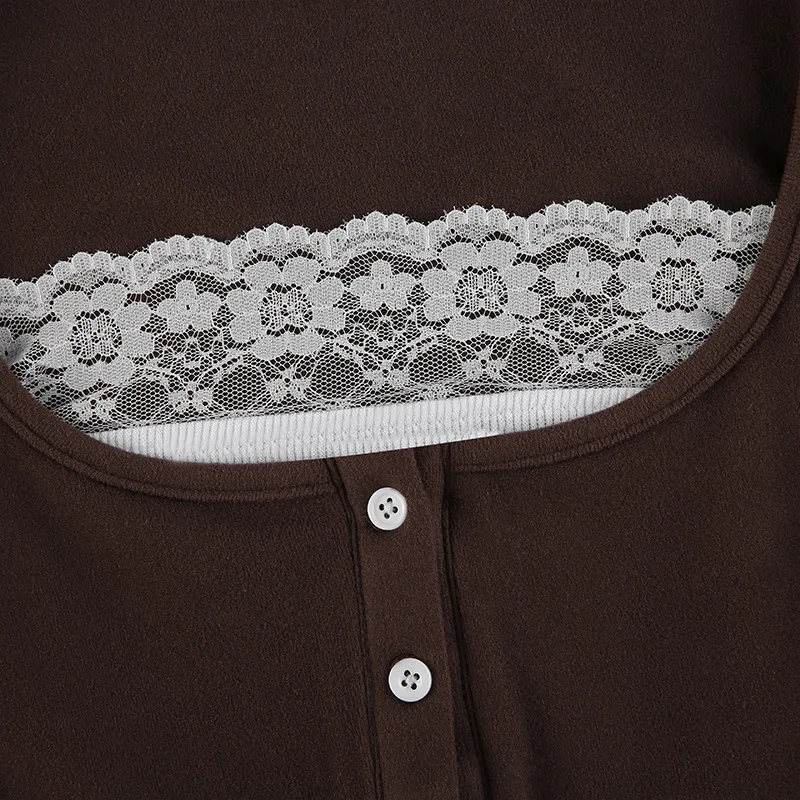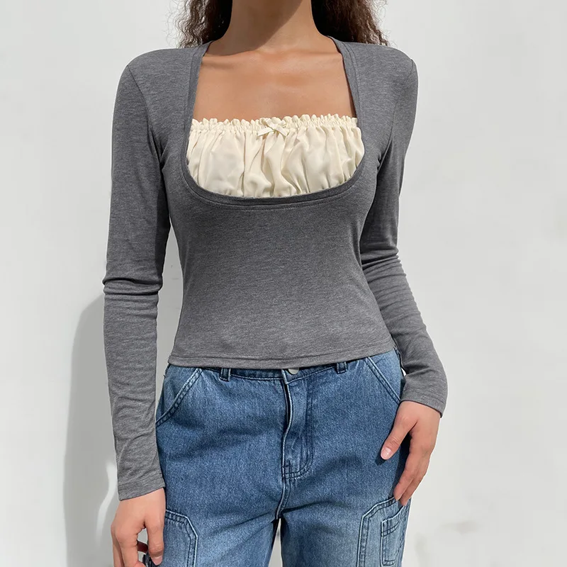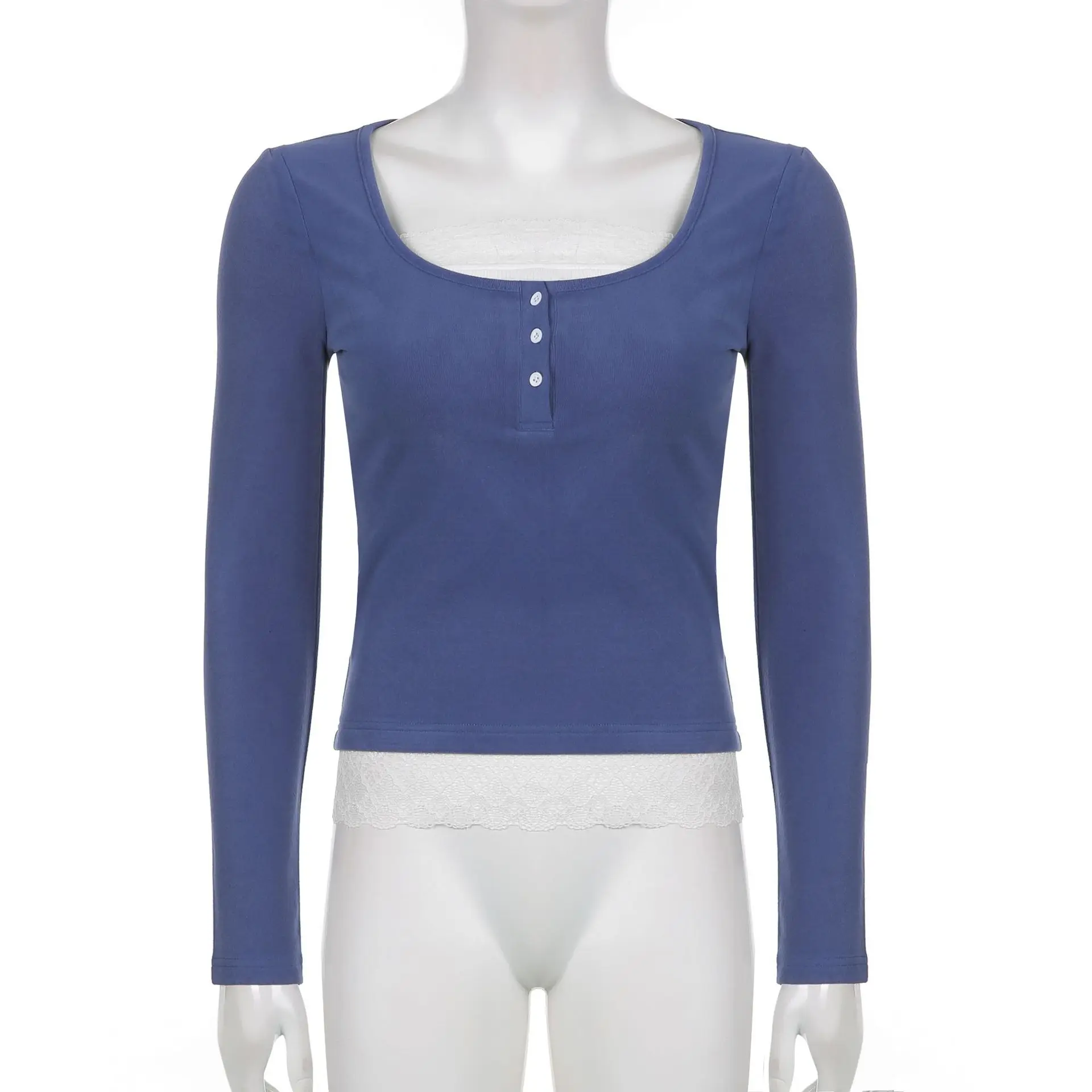 Футболка женская с длинным рукавом, кружевной кроп-топ в стиле пэчворк, пикантная облегающая футболка с V-образным вырезом, 90-х, Y2K, зима-весна