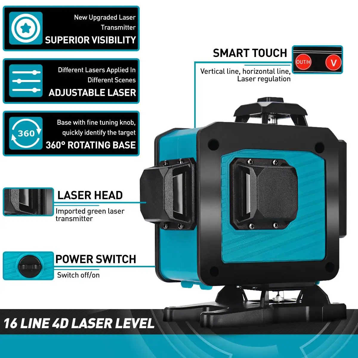 16 линий 360 горизонтальный вертикальный крест 4D зеленый светильник лазерный уровень самонивелирующийся супер мощный лазерный луч