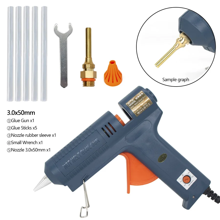 : Насадки клеевого пистолета могут быть заменены свободно, все насадки имеют функцию герметичного клея. Чистый медный материал более прочный. Все наборы содержат различные насадки для удовлетворения ваших различных потребностей в работе.