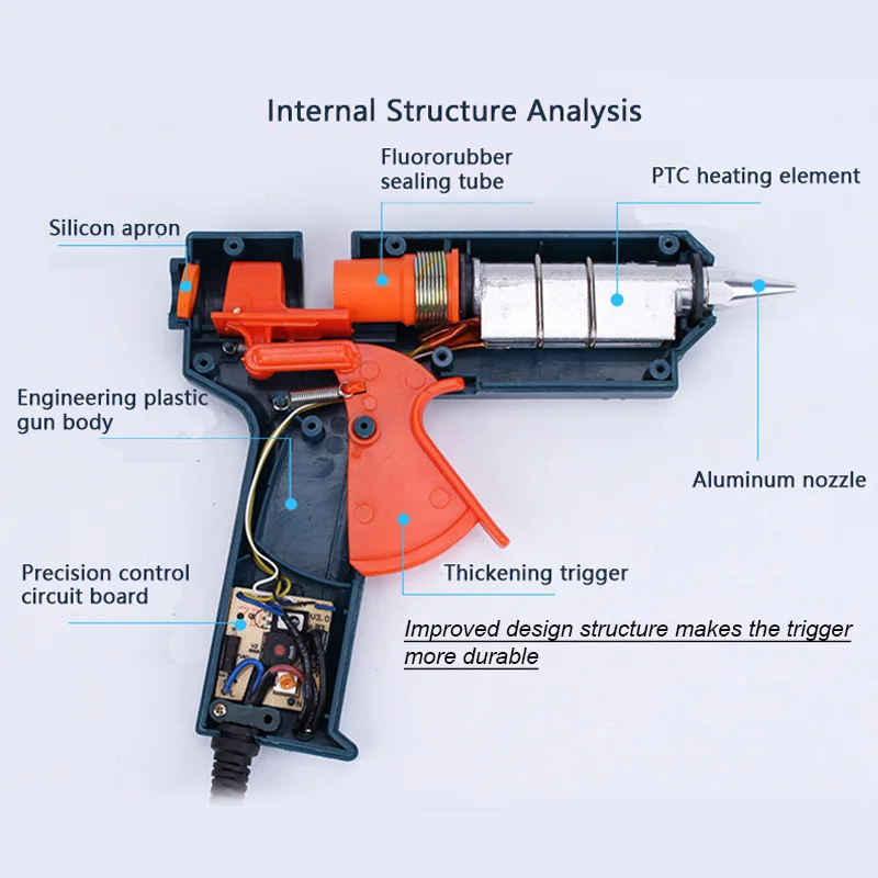 : Используйте термочувствительный нагревательный элемент PTC, увеличьте отверстие для рассеивания тепла, чтобы предотвратить перегрев клеевого пистолета; С изолированным шнуром питания и встроенным f, сделайте этот клеевой пистолет несколько защитой, безопаснее в использовании.