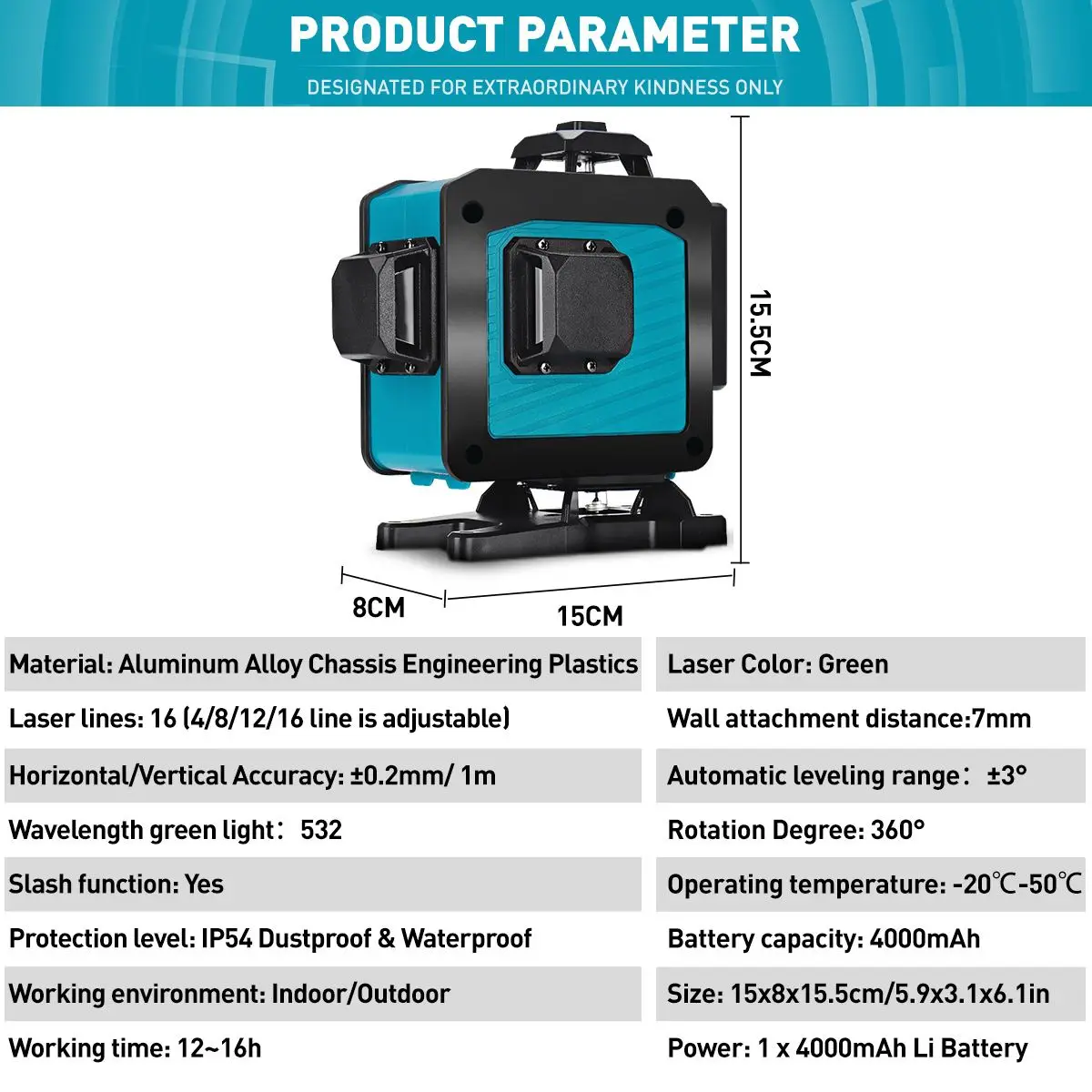 16 линий 360 горизонтальный вертикальный крест 4D зеленый светильник лазерный уровень самонивелирующийся супер мощный лазерный луч
