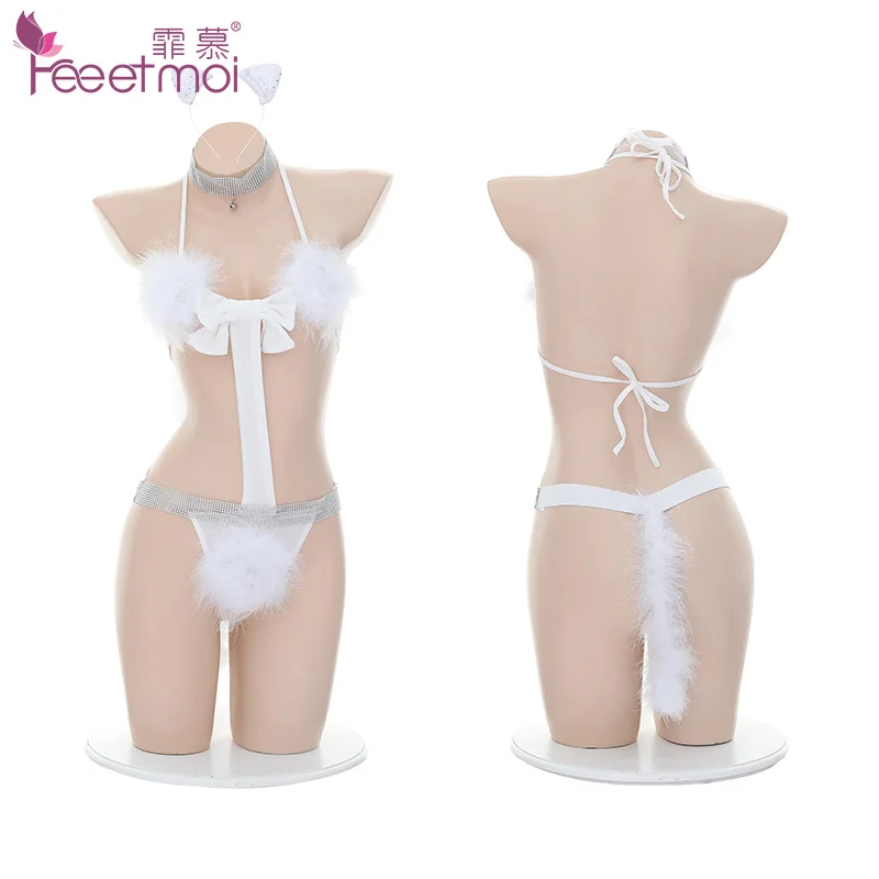 Белый Аниме Кошка Косплей Униформа эротические просвечивающие костюмы сексуальные кружевные пижамы милый Лолита котенок белье набор для женщин