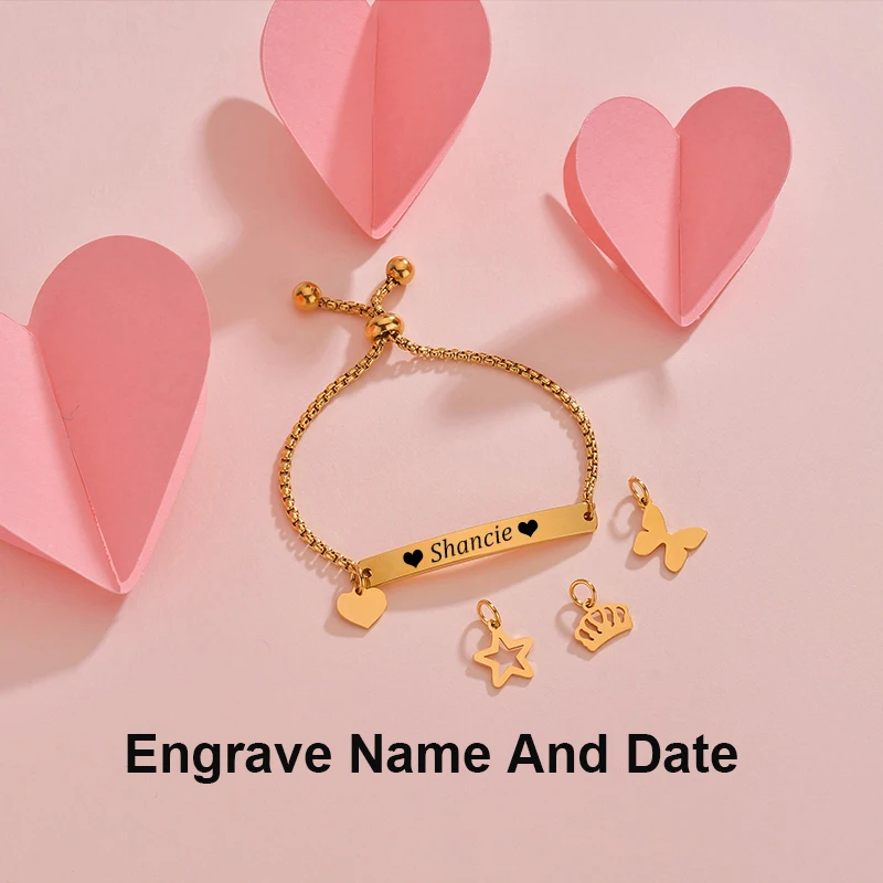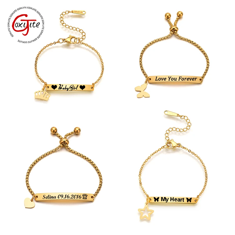 Браслет Goxijite с гравировкой имени для женщин и детей, браслет из нержавеющей стали с сердечком, короной, бабочкой, звездами, гравировкой даты, подарок