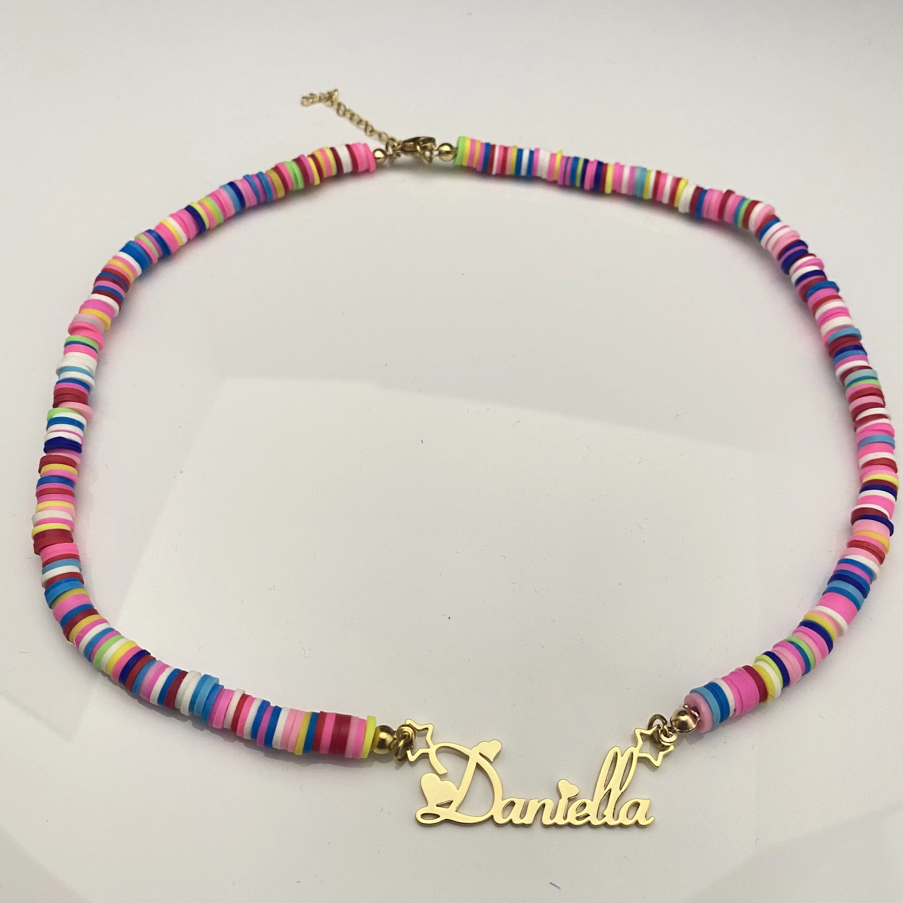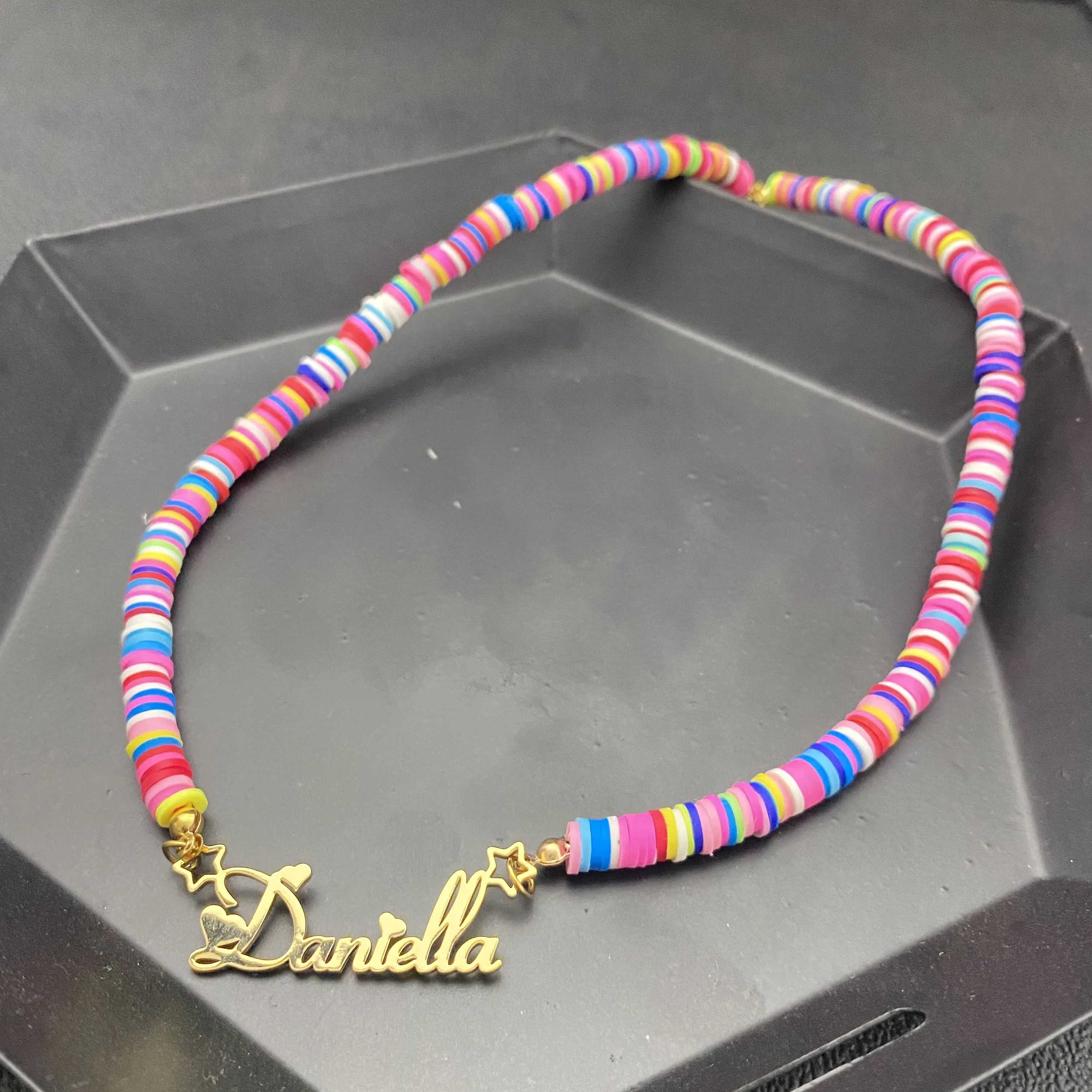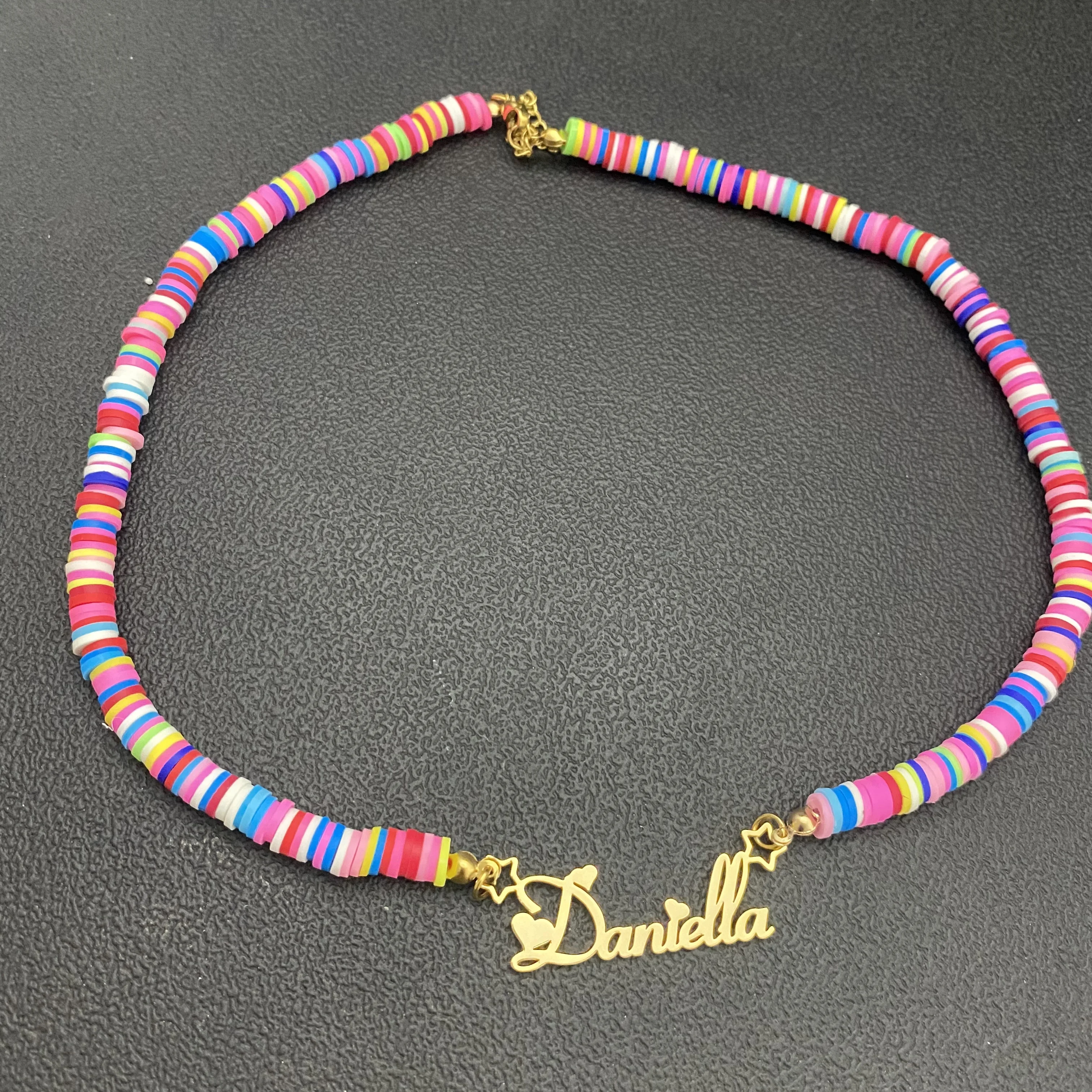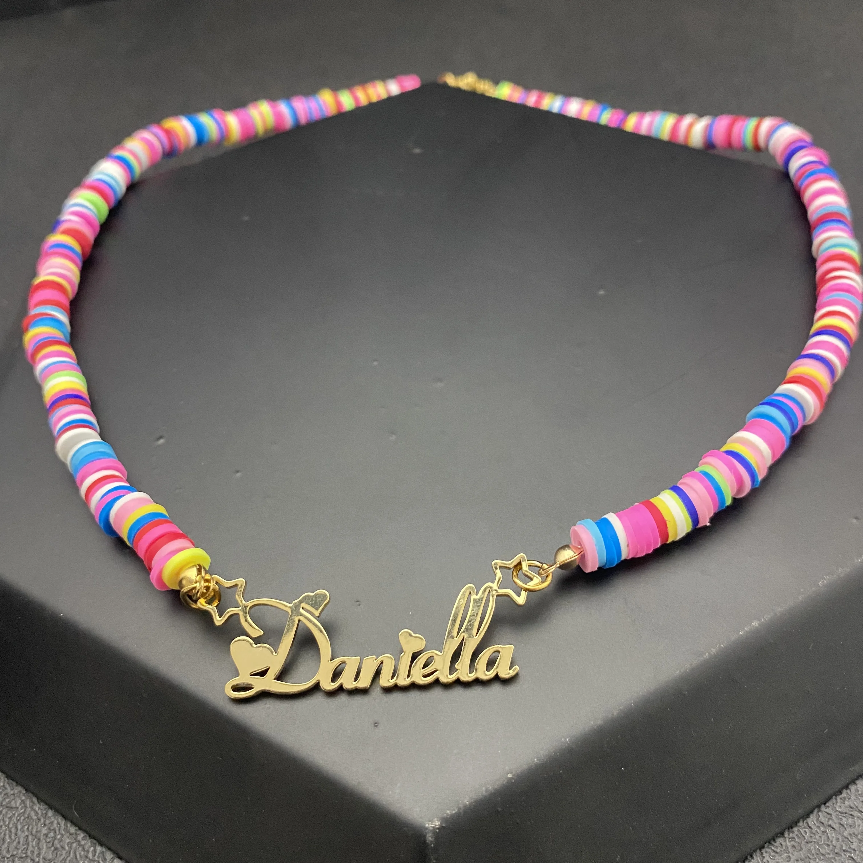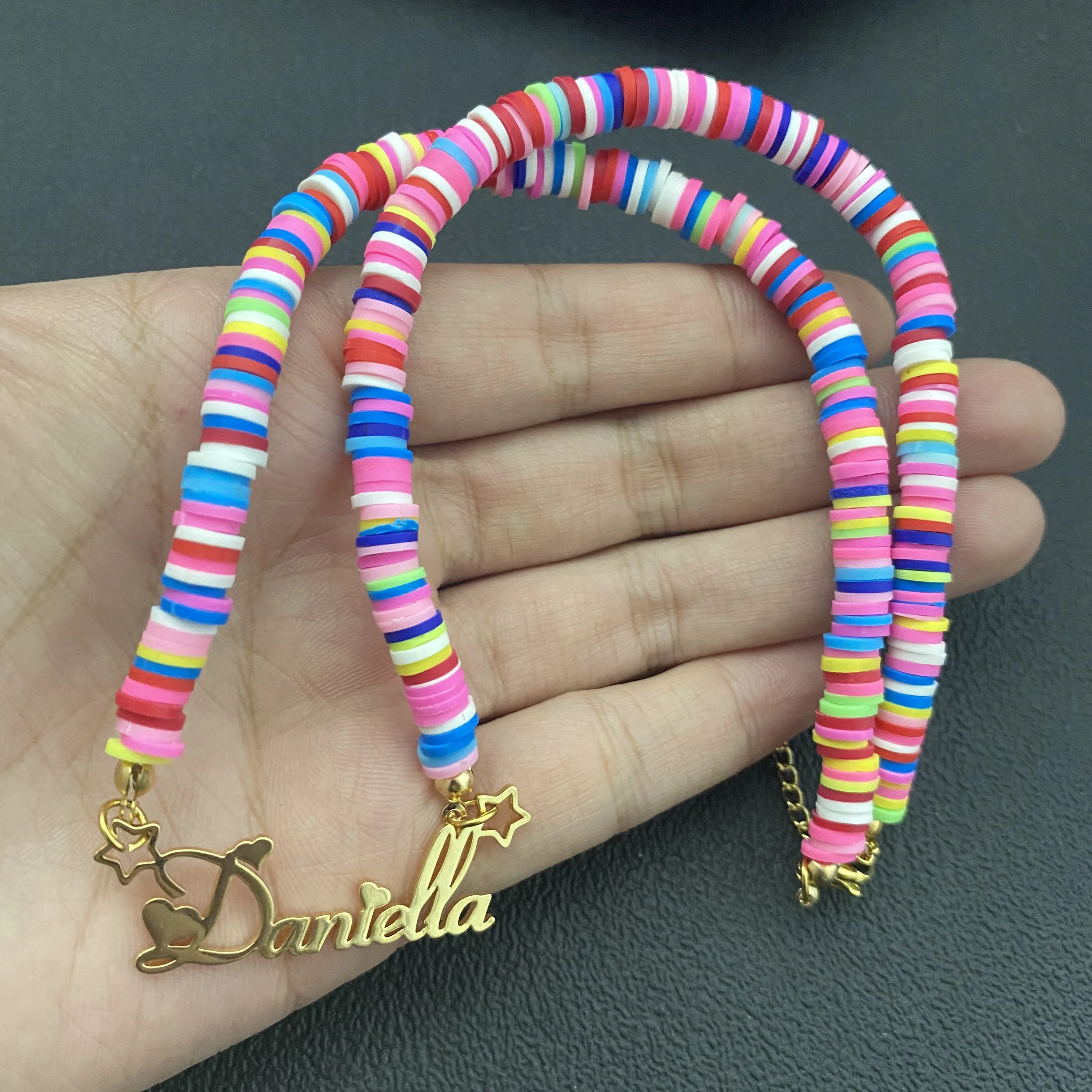 Ожерелье из бисера Heishi, именные ожерелья, Золотая табличка из нержавеющей стали, персонализированная Радужная мягкая глиняная Подвеска для женщин и девушек