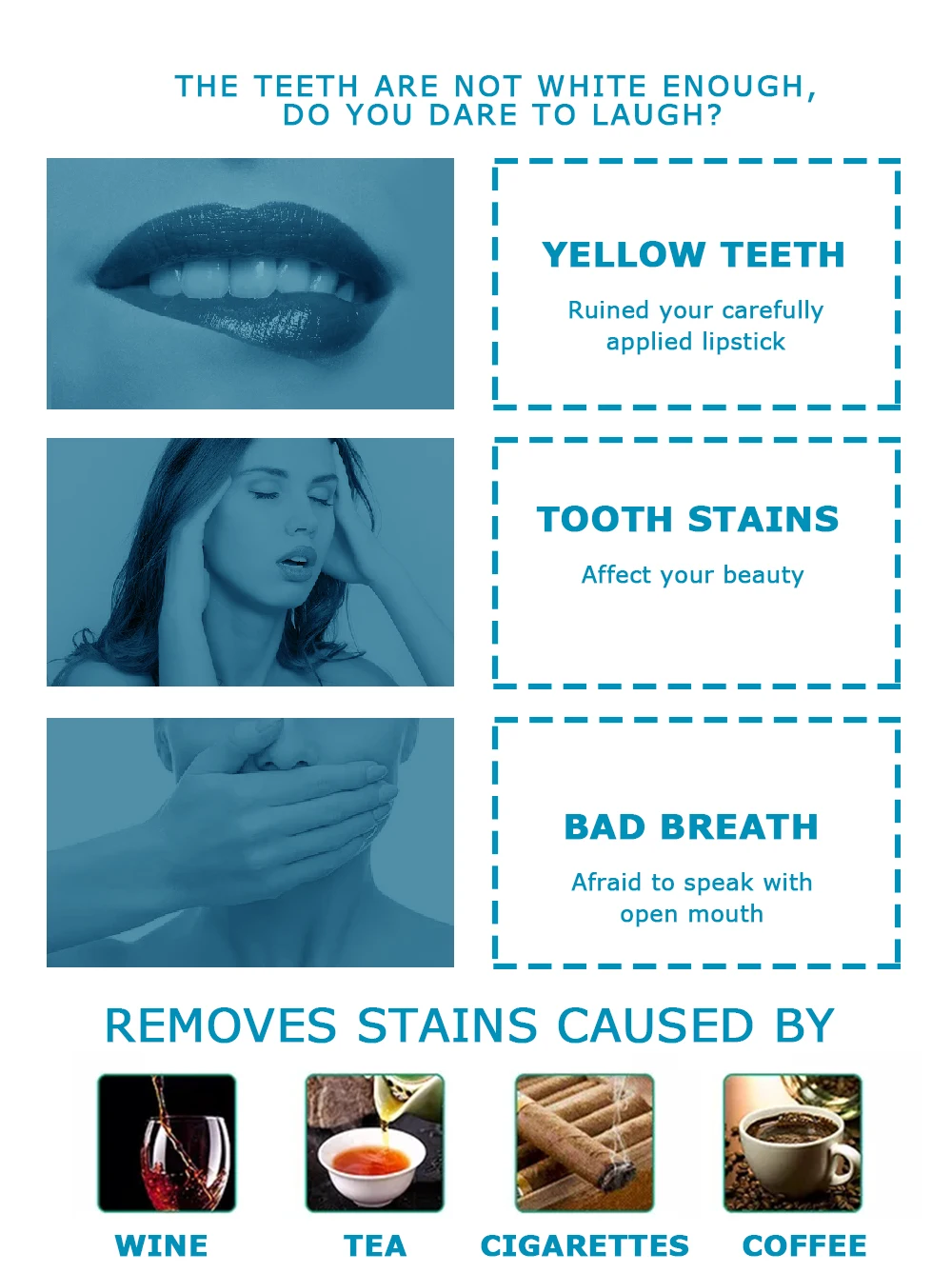 Зубы недостаточно белые, смеетесь ли вы смеяться? Желтые зубы разрушили вашу тщательно приложенную помаду от зубных пятен, влияют на вашу красоту, плохо дышат, боясь говорить с открытым ртом, удаляет пятна, вызванные rremots пятна, вызванные вином/чаем/сигаретами/кофе